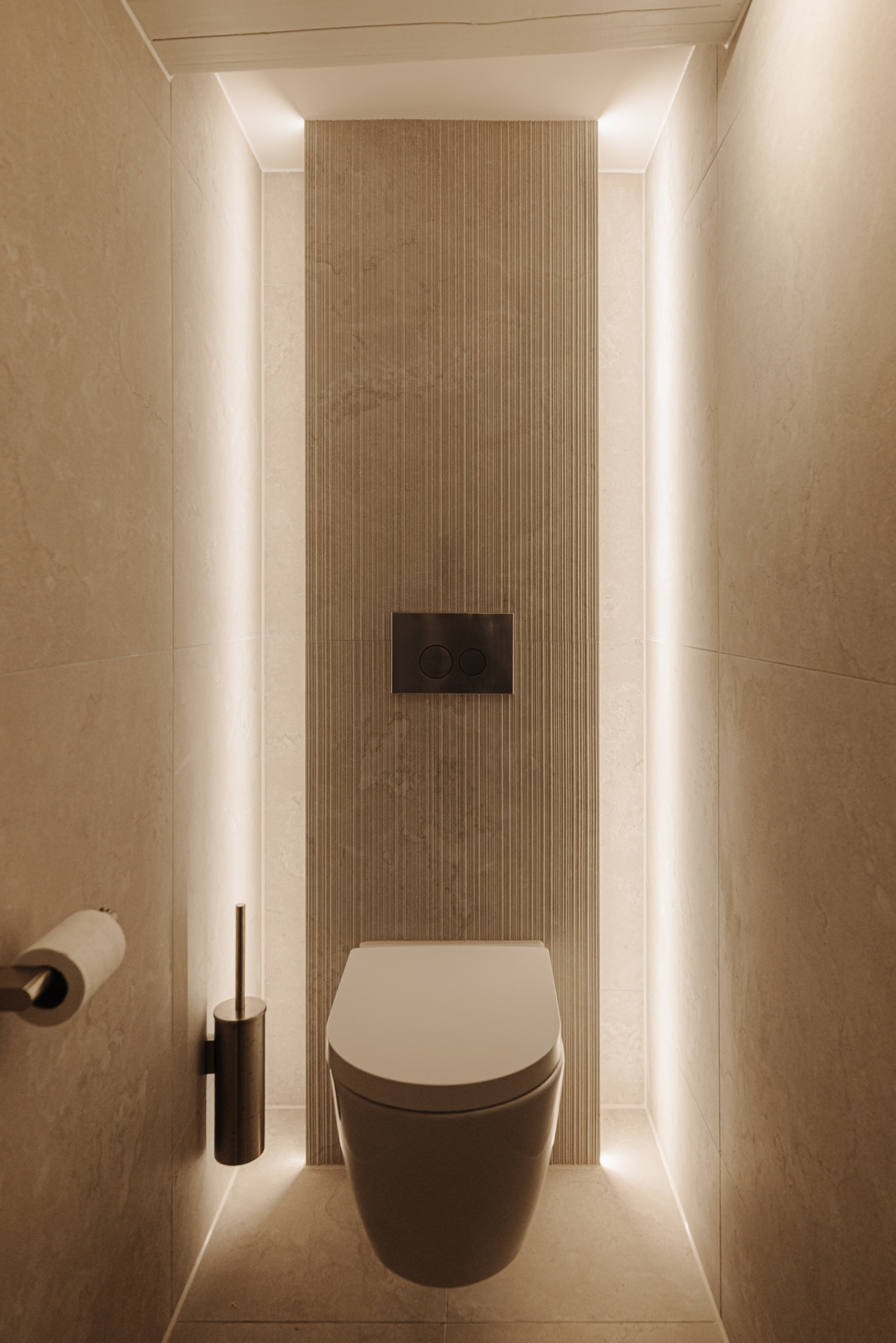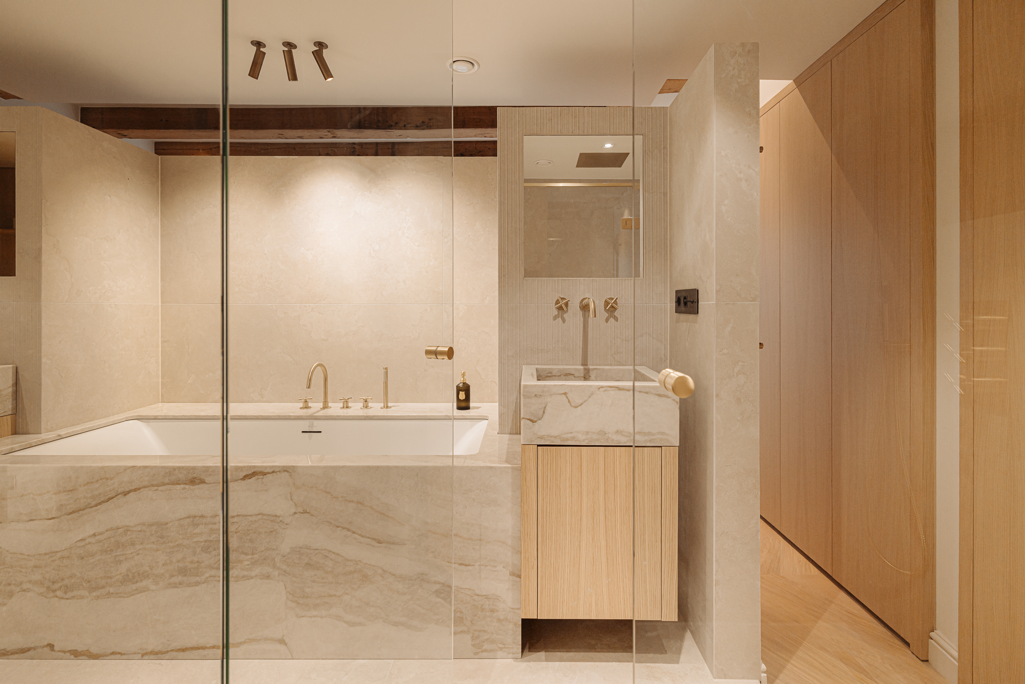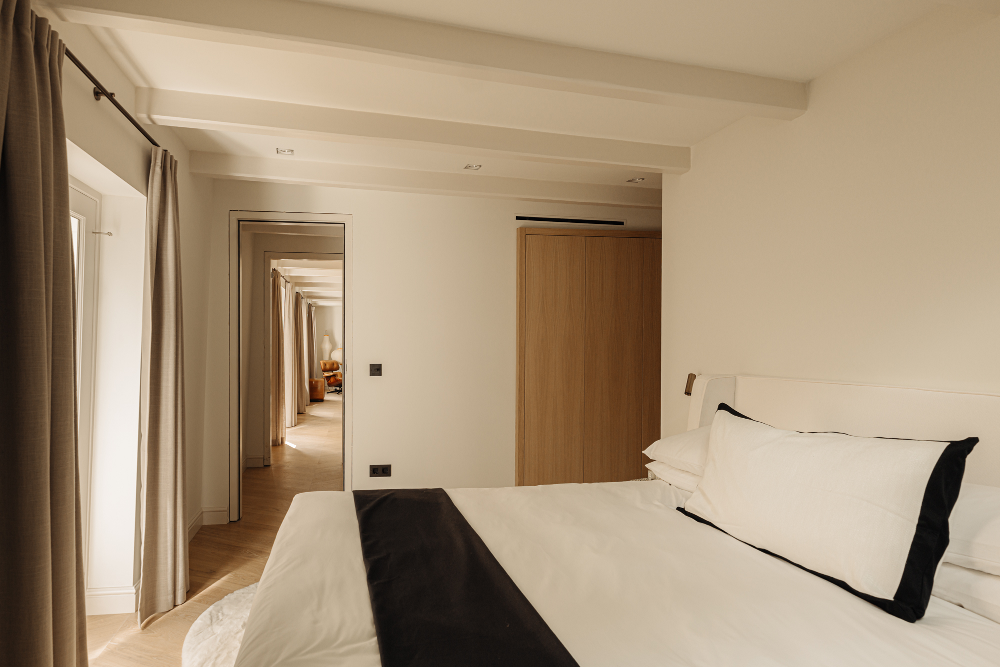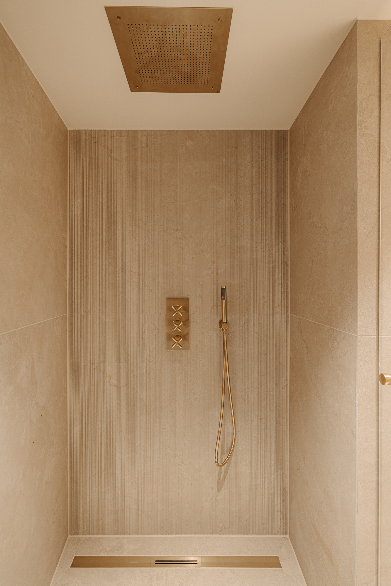At the rear lies the exceptionally luxurious and serene primary suite, fitted with built-in wardrobes on both sides and a stylish dressing table. From two entrances there is access to the spacious bathroom, finished with natural stone and equipped with a double sink, twin rain shower and a bathtub.