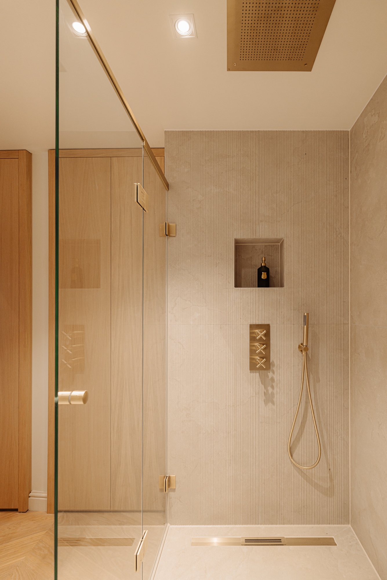 •Custom-made oak built-in cupboards, matching the wood of the floor;