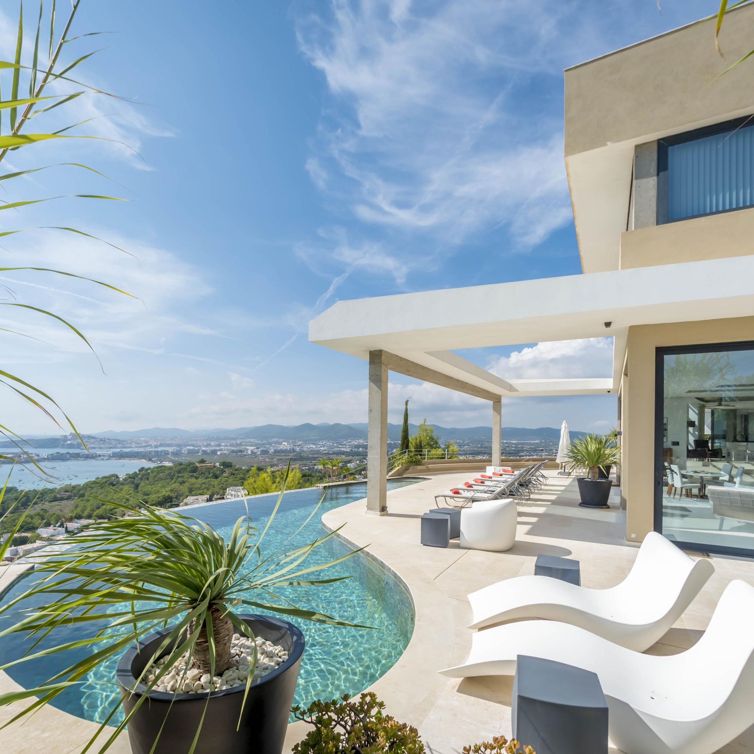 A villa set in an elevated position close to Ibiza Town, defined by open views and a clear architectural layout.