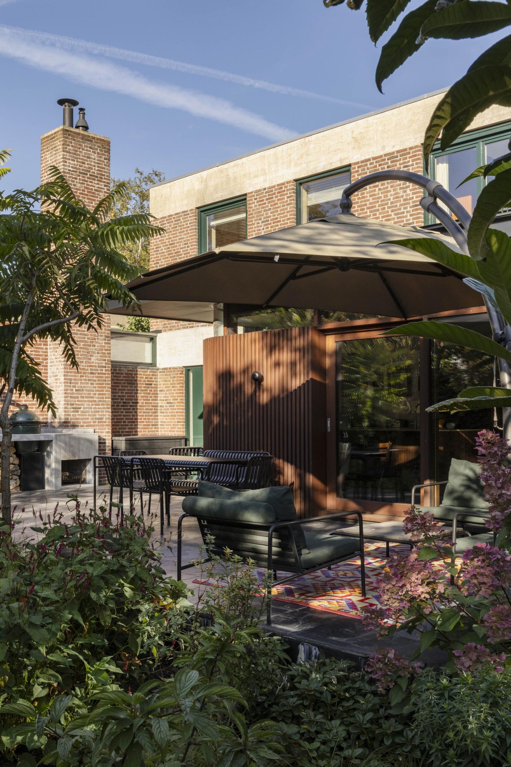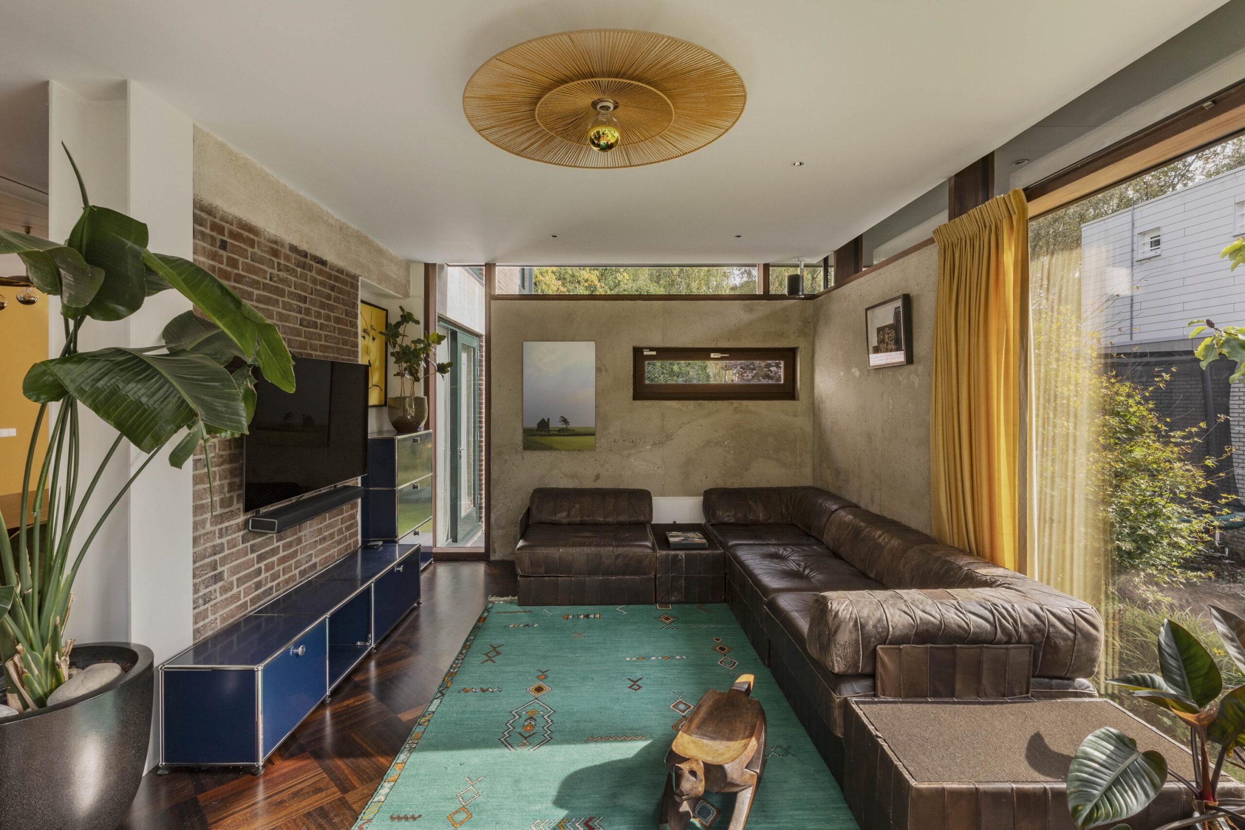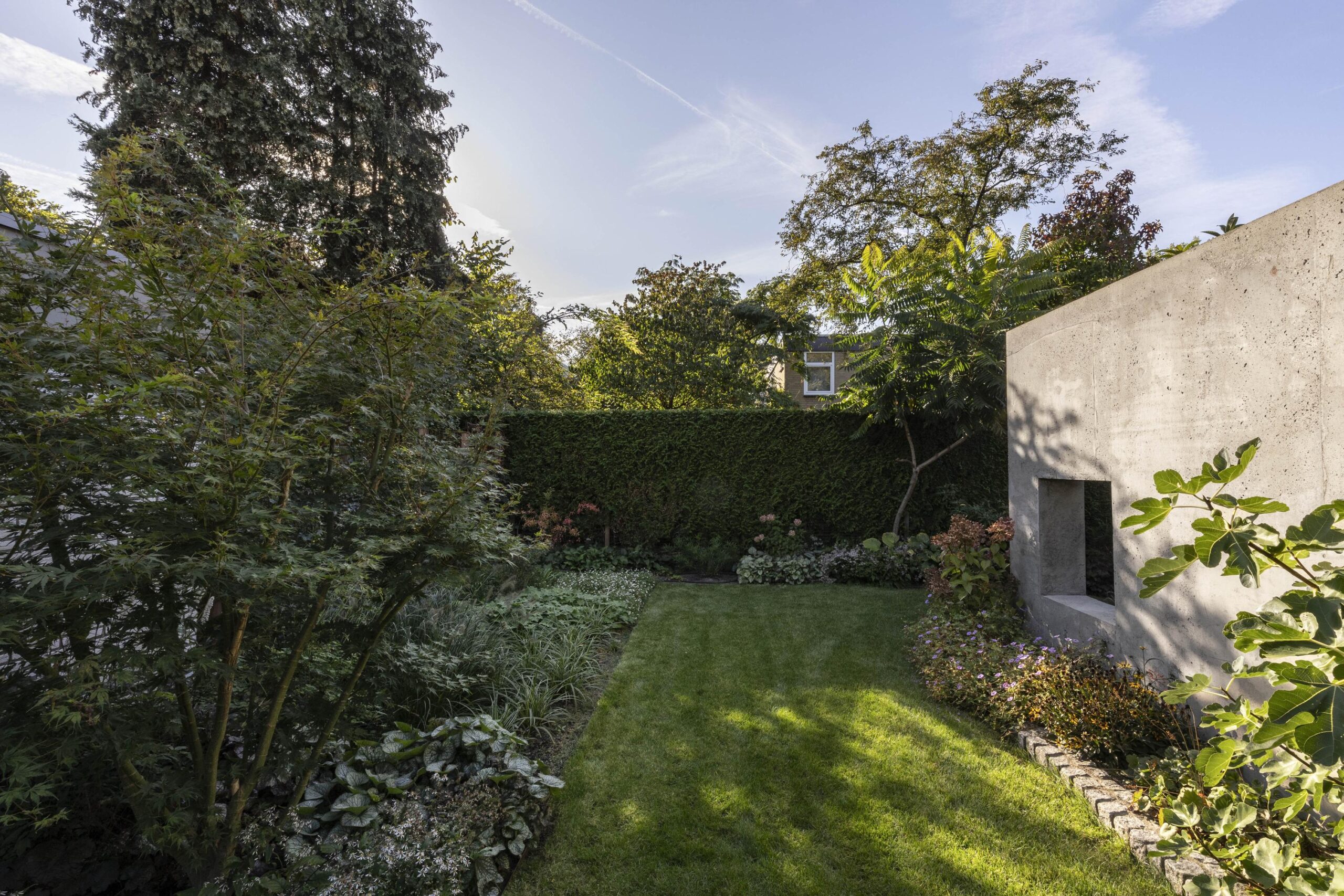 The garden was designed by landscape architect Pieter Hessels and forms a natural extension of the interior. With a total area of approximately 377 m² and a spacious 55 m² sun terrace facing southwest, this green outdoor area offers a sunny spot at any time of the day. The garden wraps around the house, creating a seamless connection between indoors and outdoors. At the front of the house, there is a private driveway with space to park two cars.
