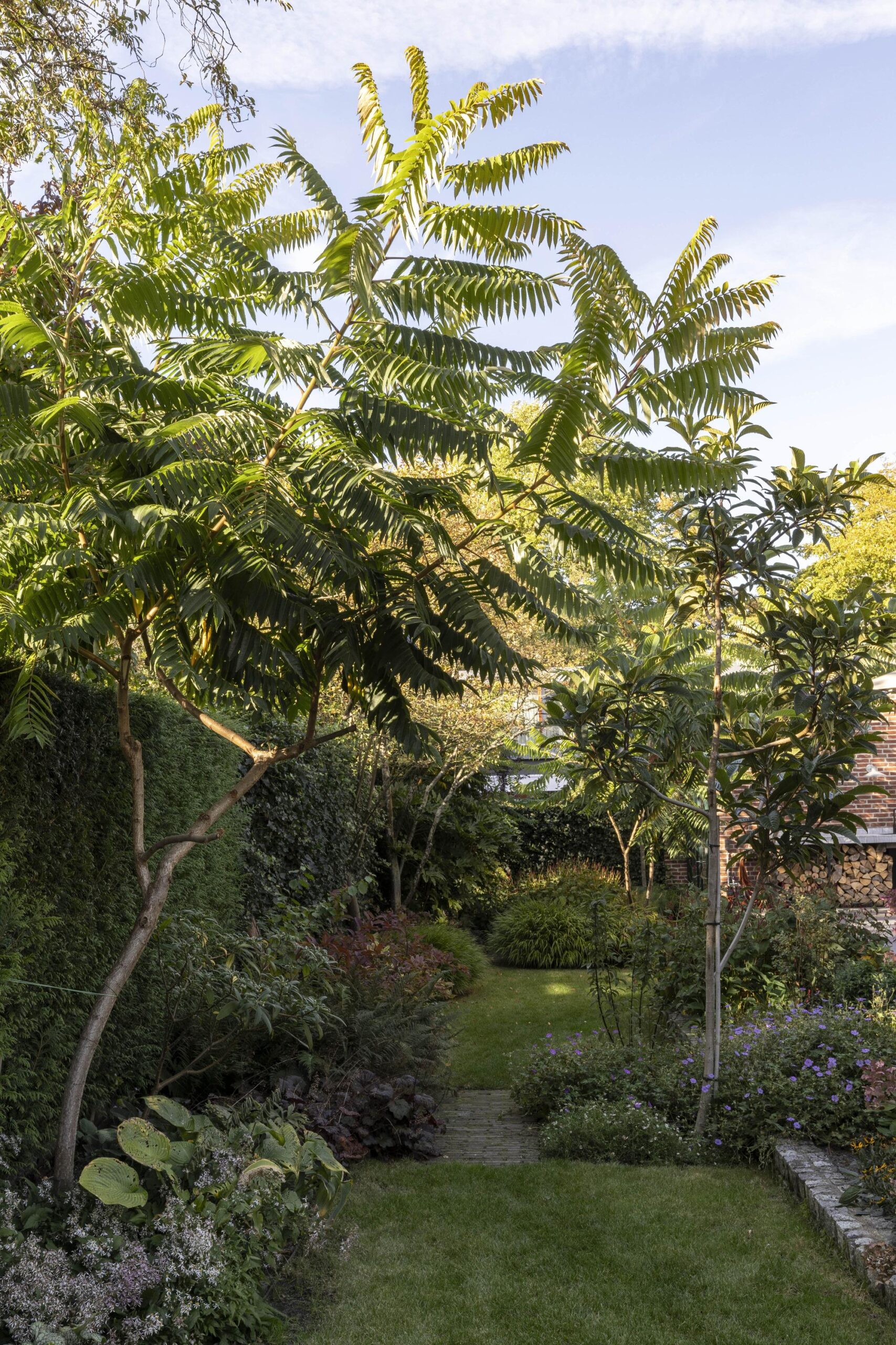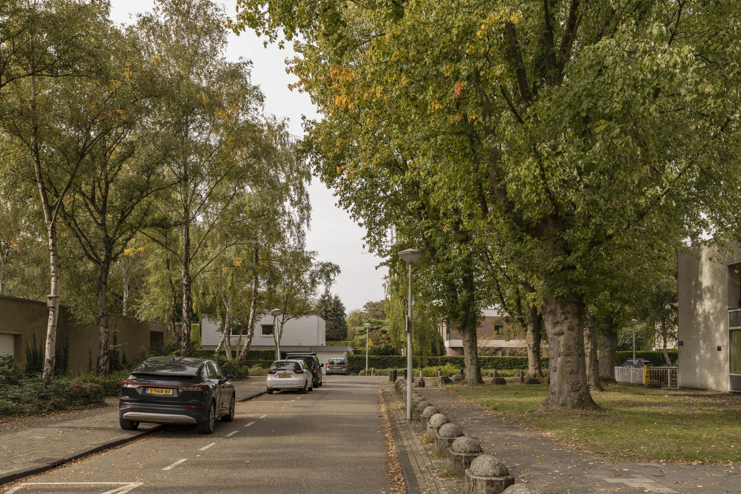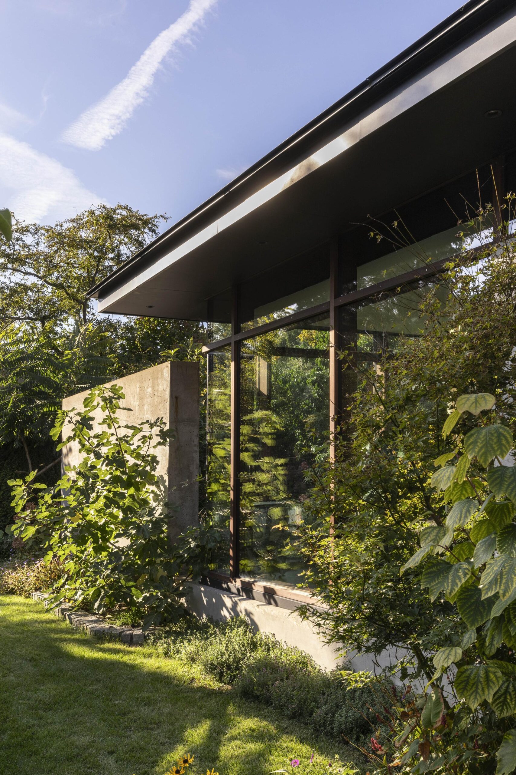 The garden was designed by landscape architect Pieter Hessels and forms a natural extension of the interior. With a total area of approximately 377 m² and a spacious 55 m² sun terrace facing southwest, this green outdoor area offers a sunny spot at any time of the day. The garden wraps around the house, creating a seamless connection between indoors and outdoors. At the front of the house, there is a private driveway with space to park two cars.