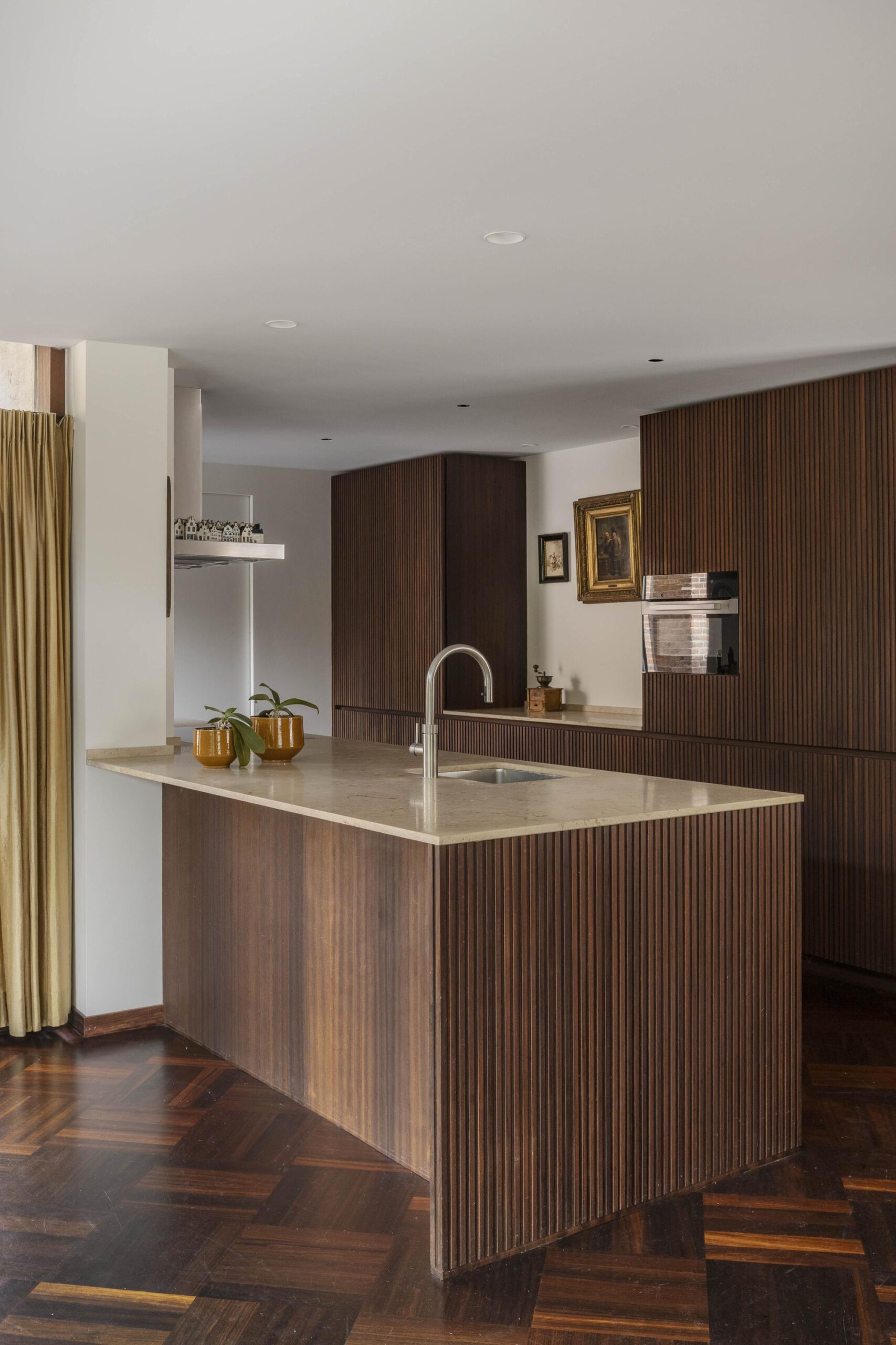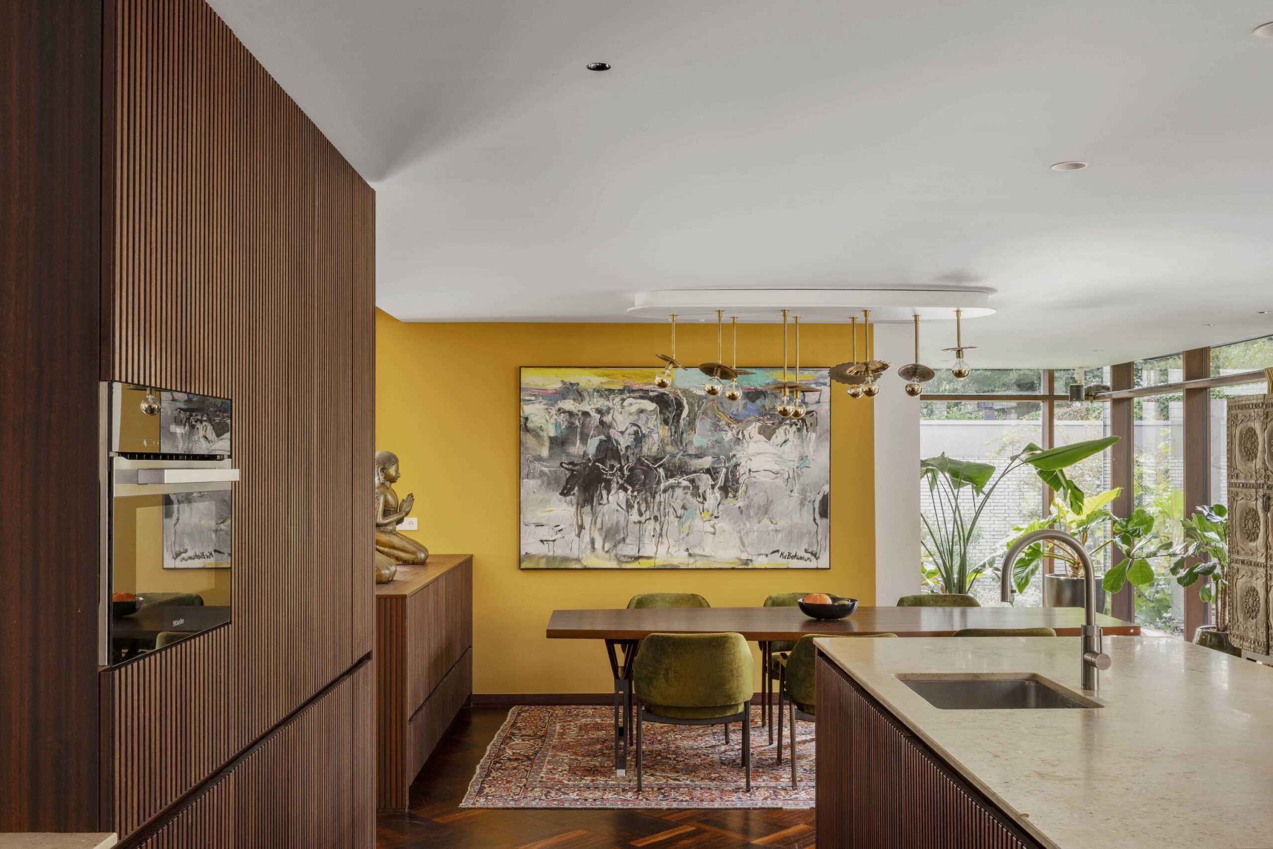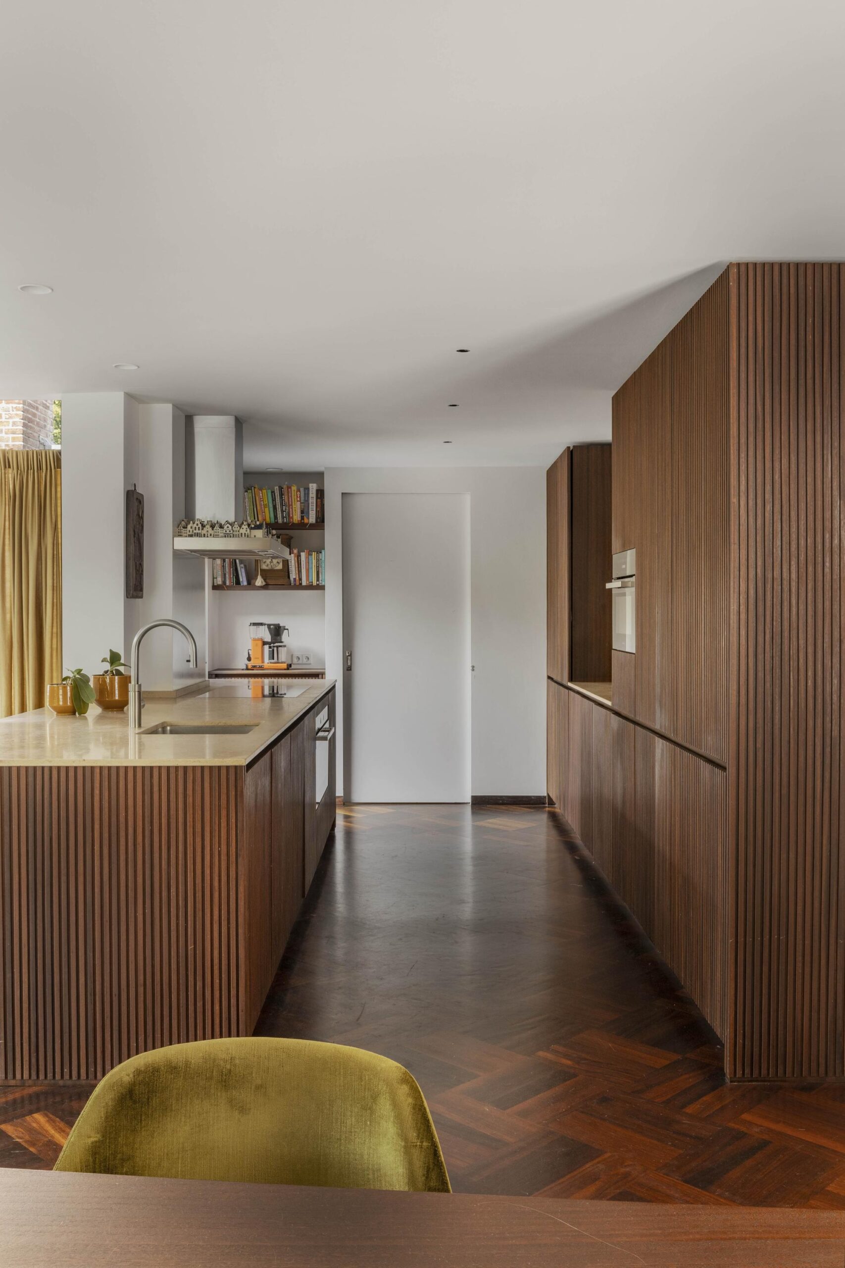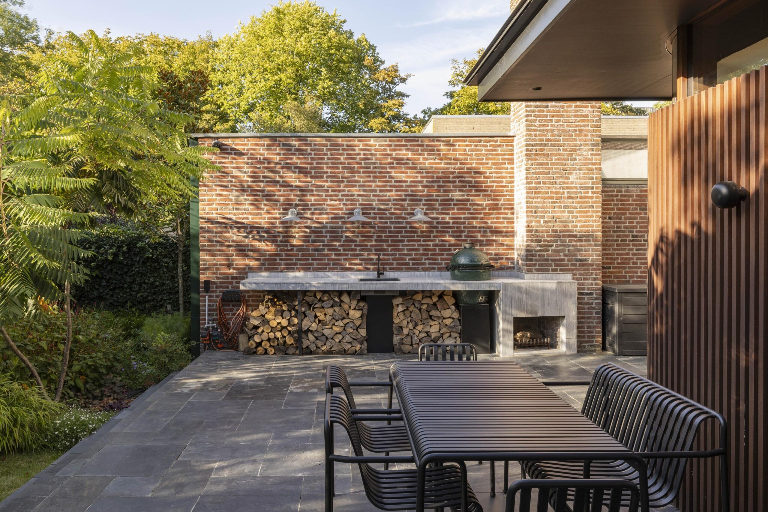 The dining area, located on the garden side, captures natural light beautifully and transitions seamlessly to the outdoor space via the terrace. The finishes feature carefully selected natural materials — high-quality wood for the flooring and window frames of the extension, and natural stone on the terrace.
