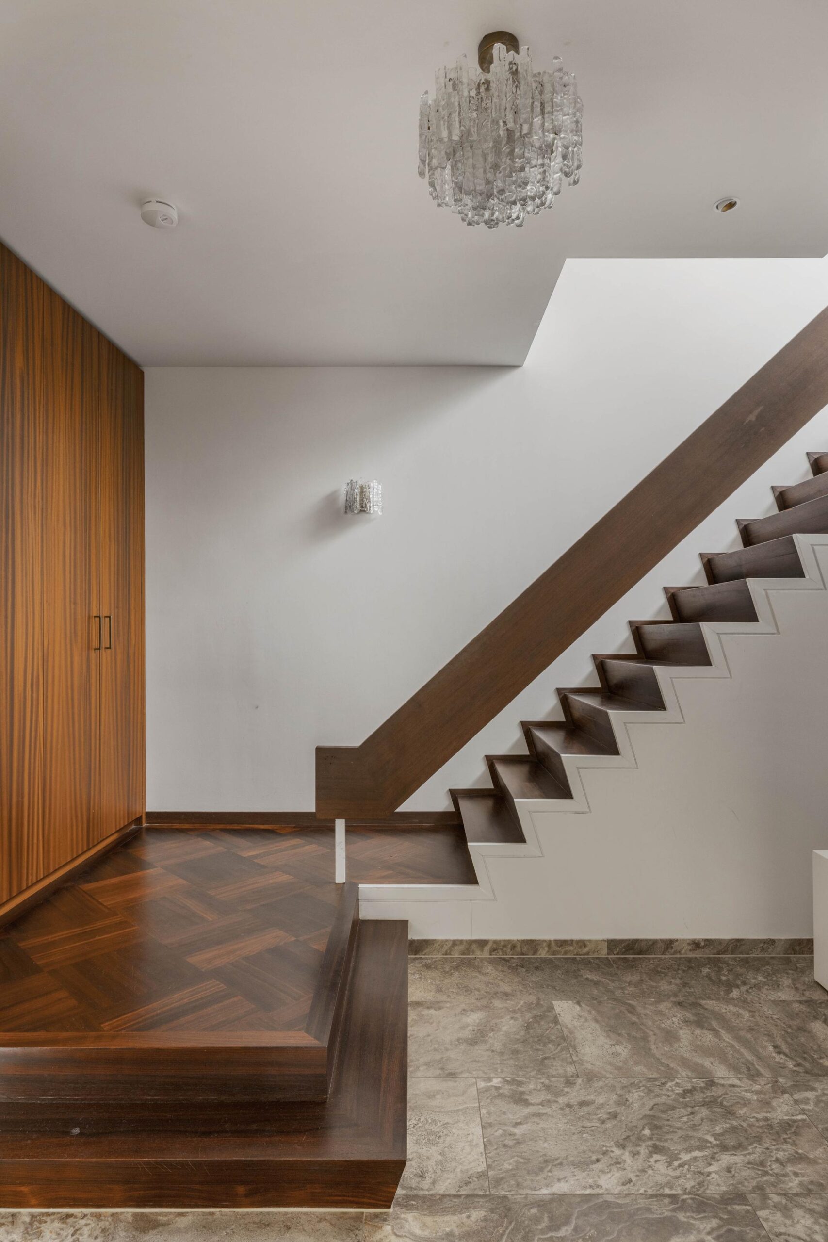 The entrance and hallway create a luxurious and spacious feel upon entering and are fitted with custom-made wardrobes. From the spacious hall, the living room is accessible, as is the stylish staircase to the first floor.