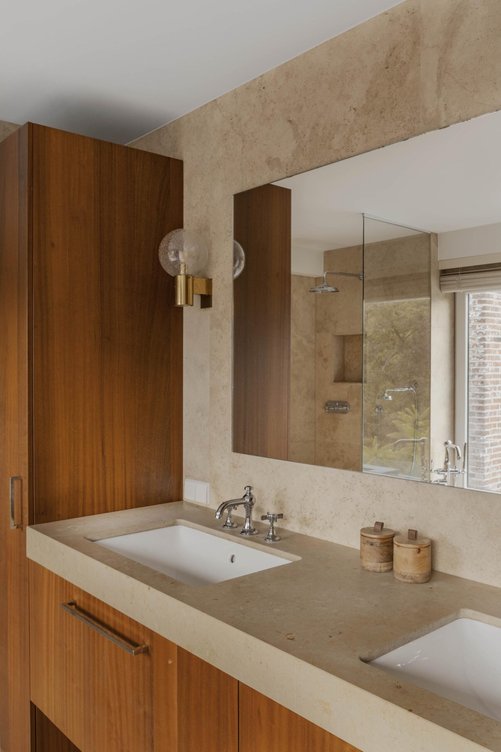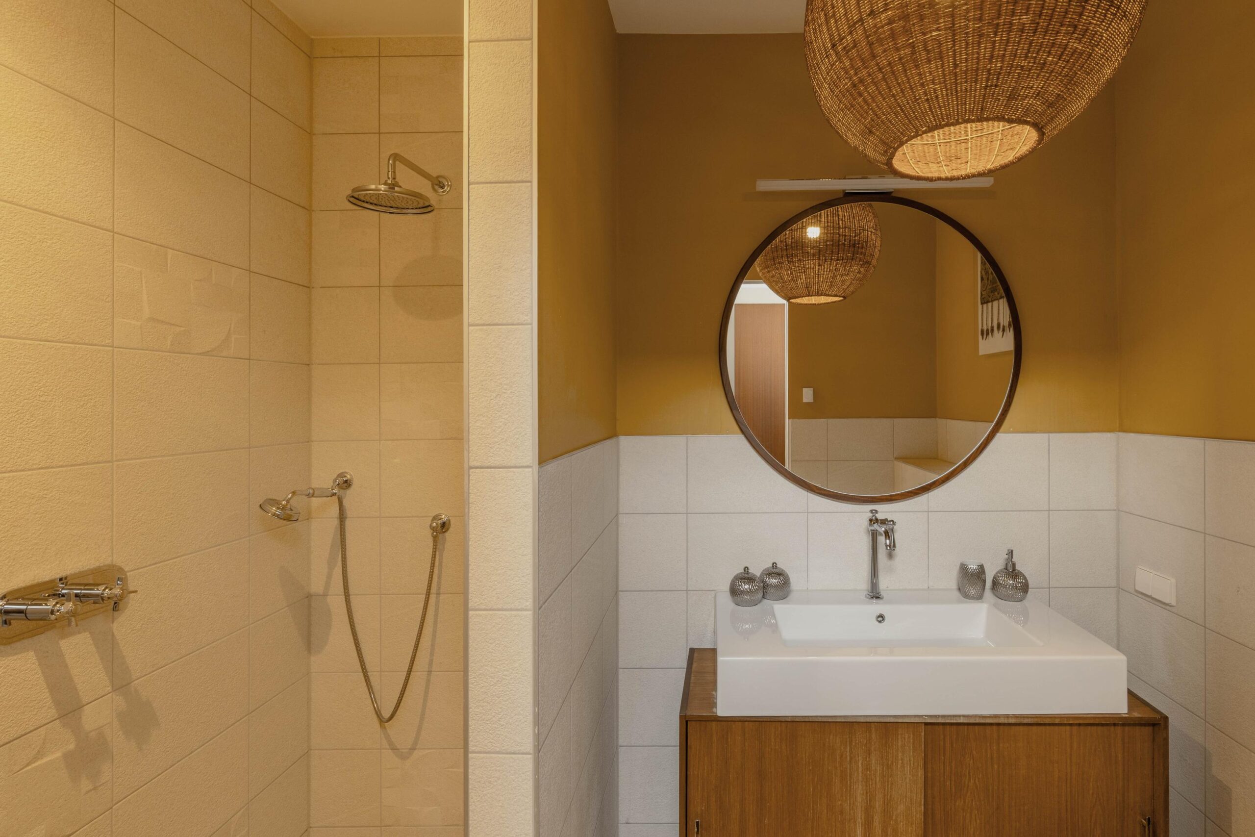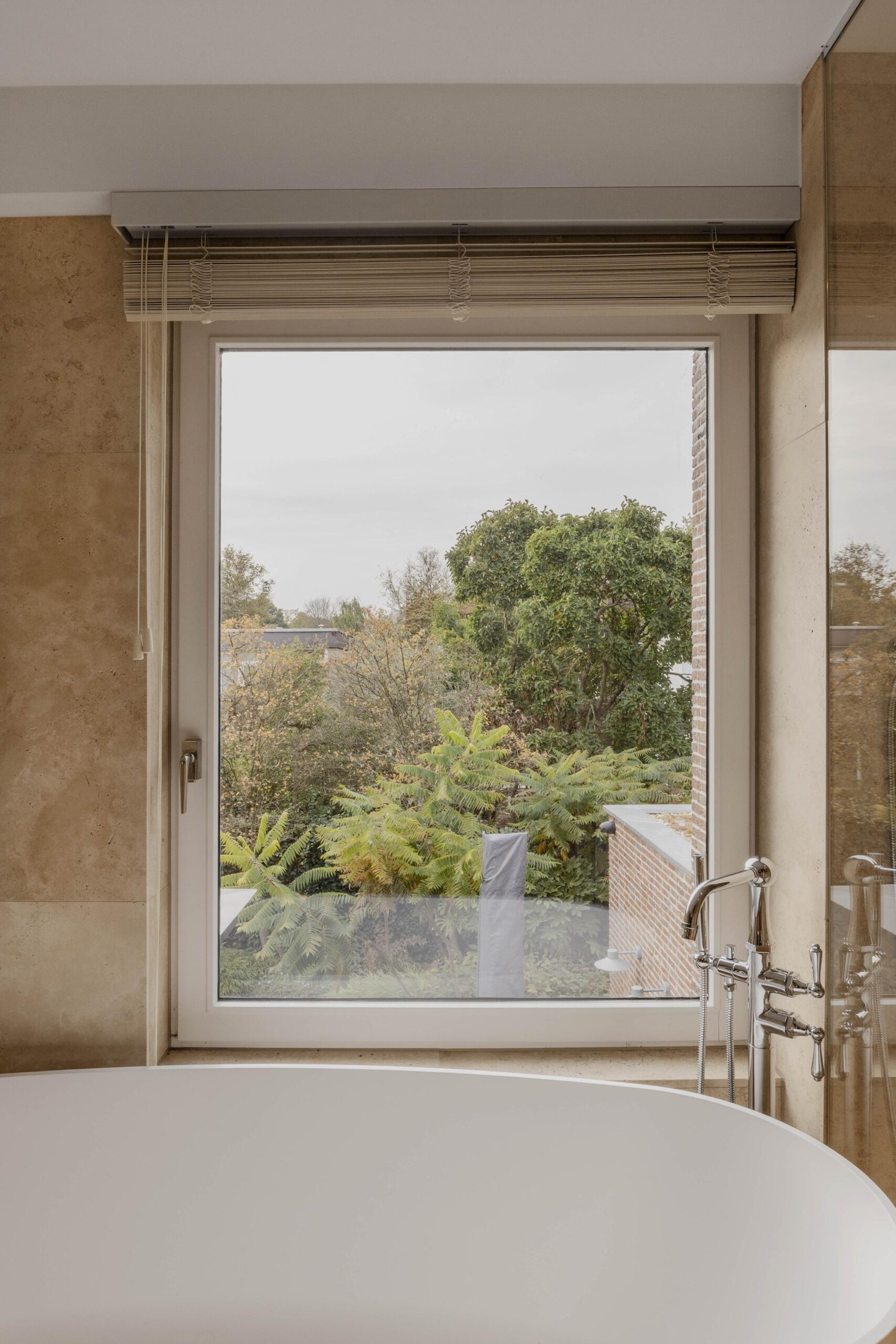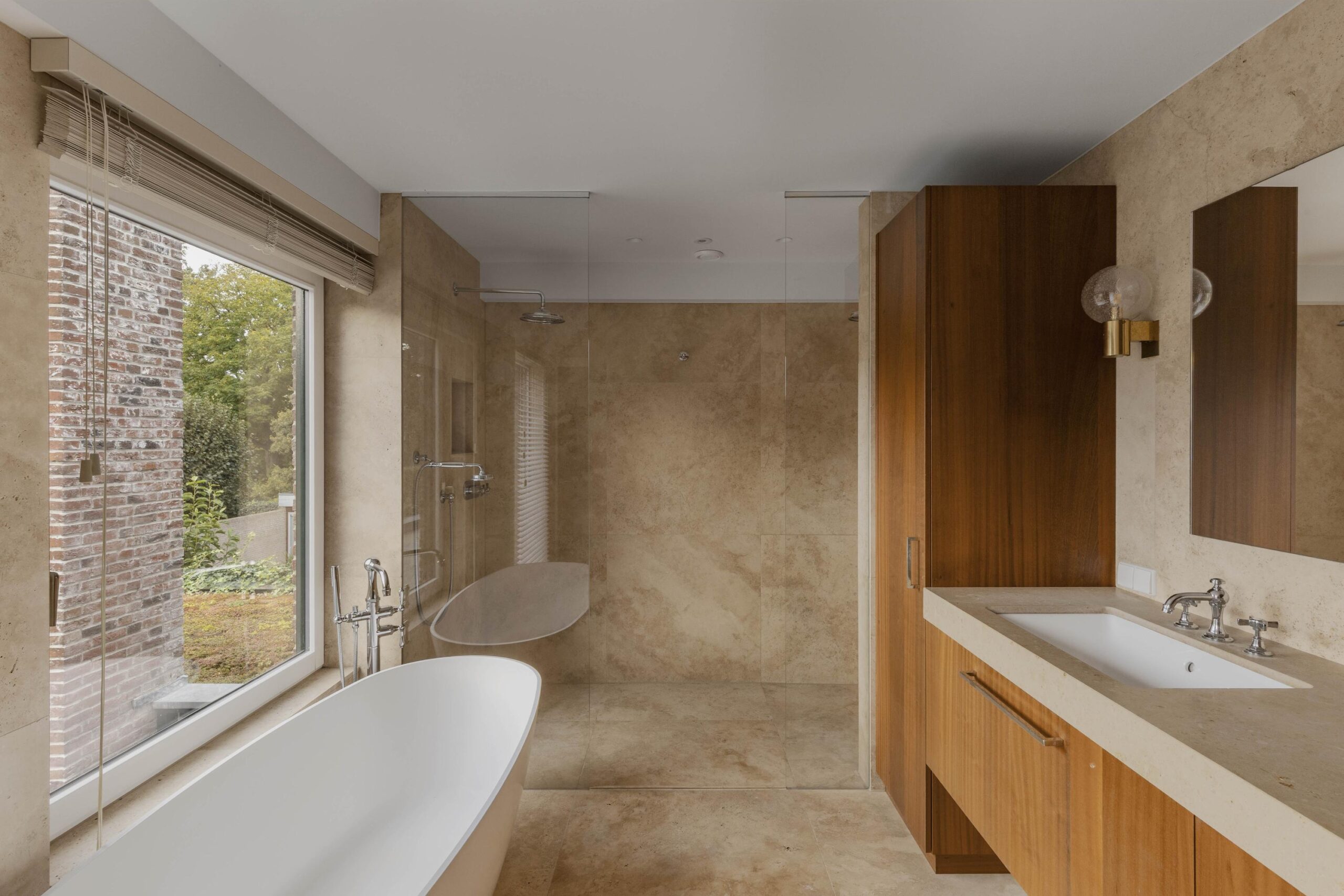 On the first floor are three spacious bedrooms. The generous master bedroom is cleverly designed with custom-made wooden closets that subtly separate the sleeping area from the wardrobe zone. An adjoining en-suite bathroom features a freestanding bathtub, walk-in shower, and double washbasin — a spa-like space with refined natural stone finishes.