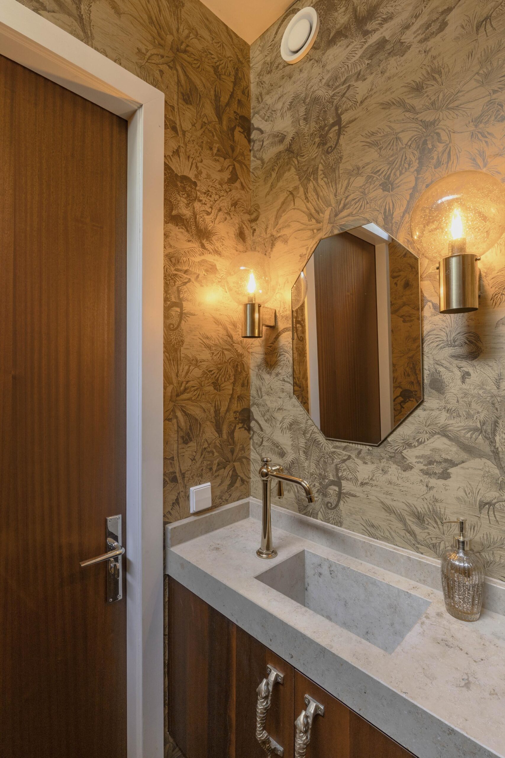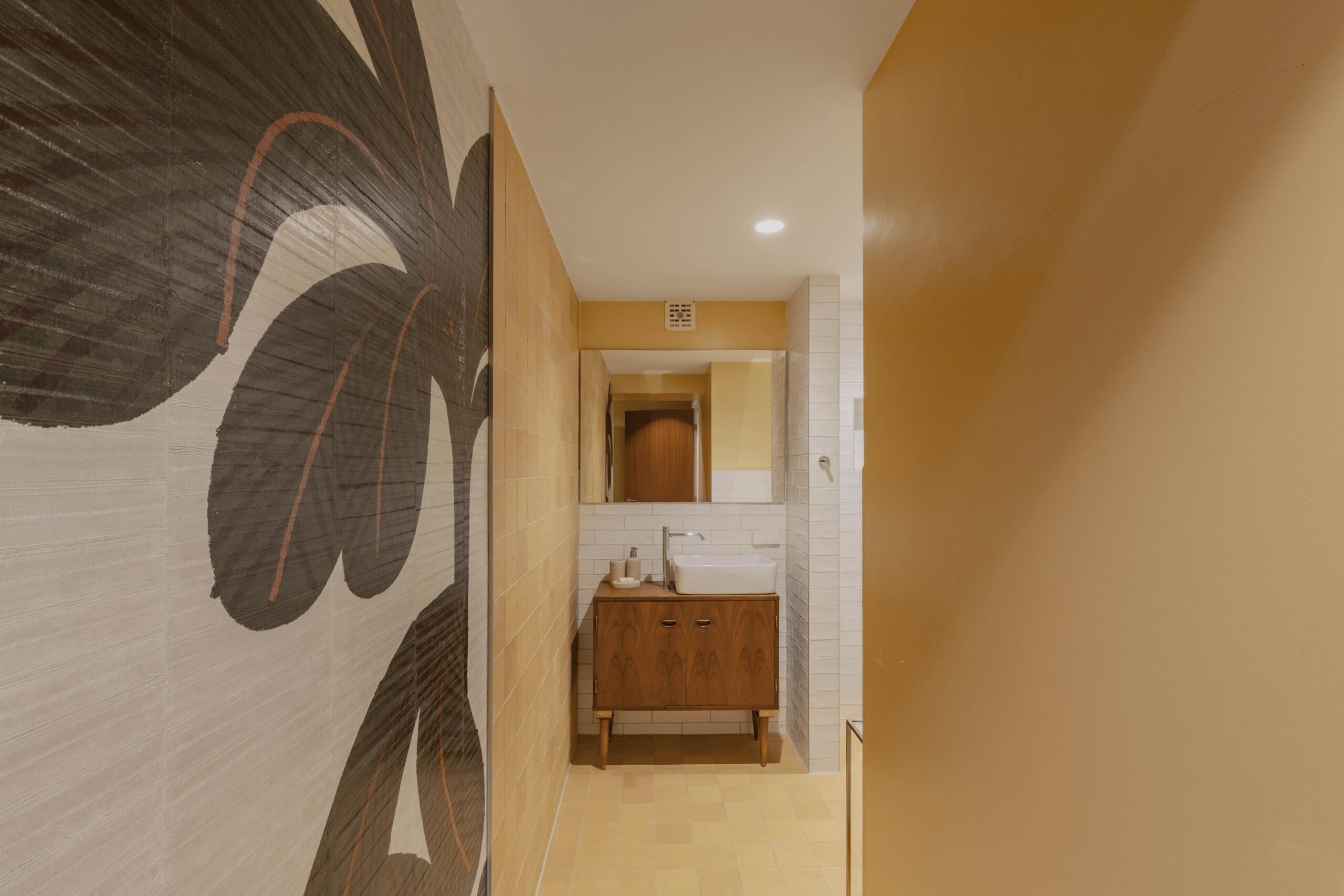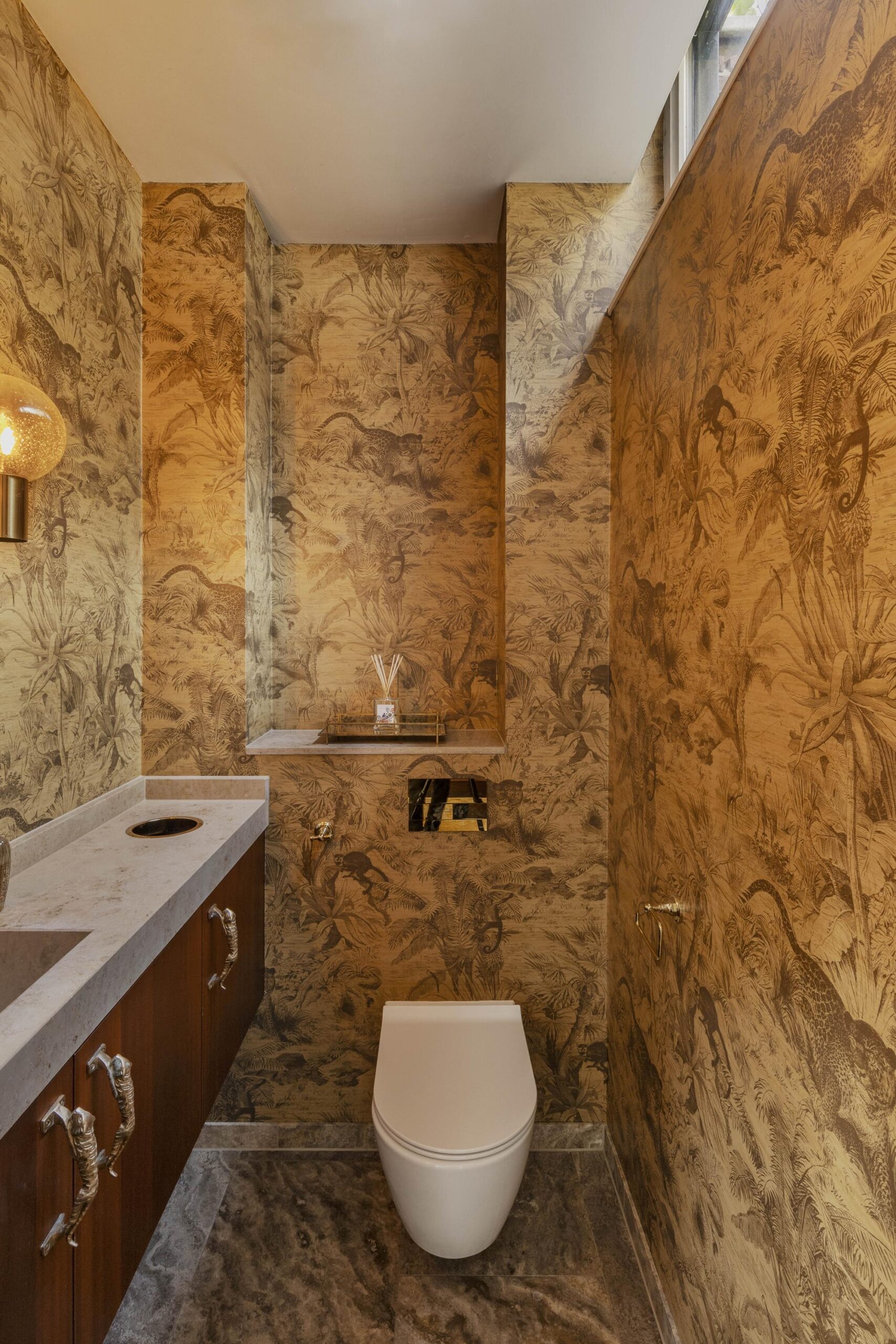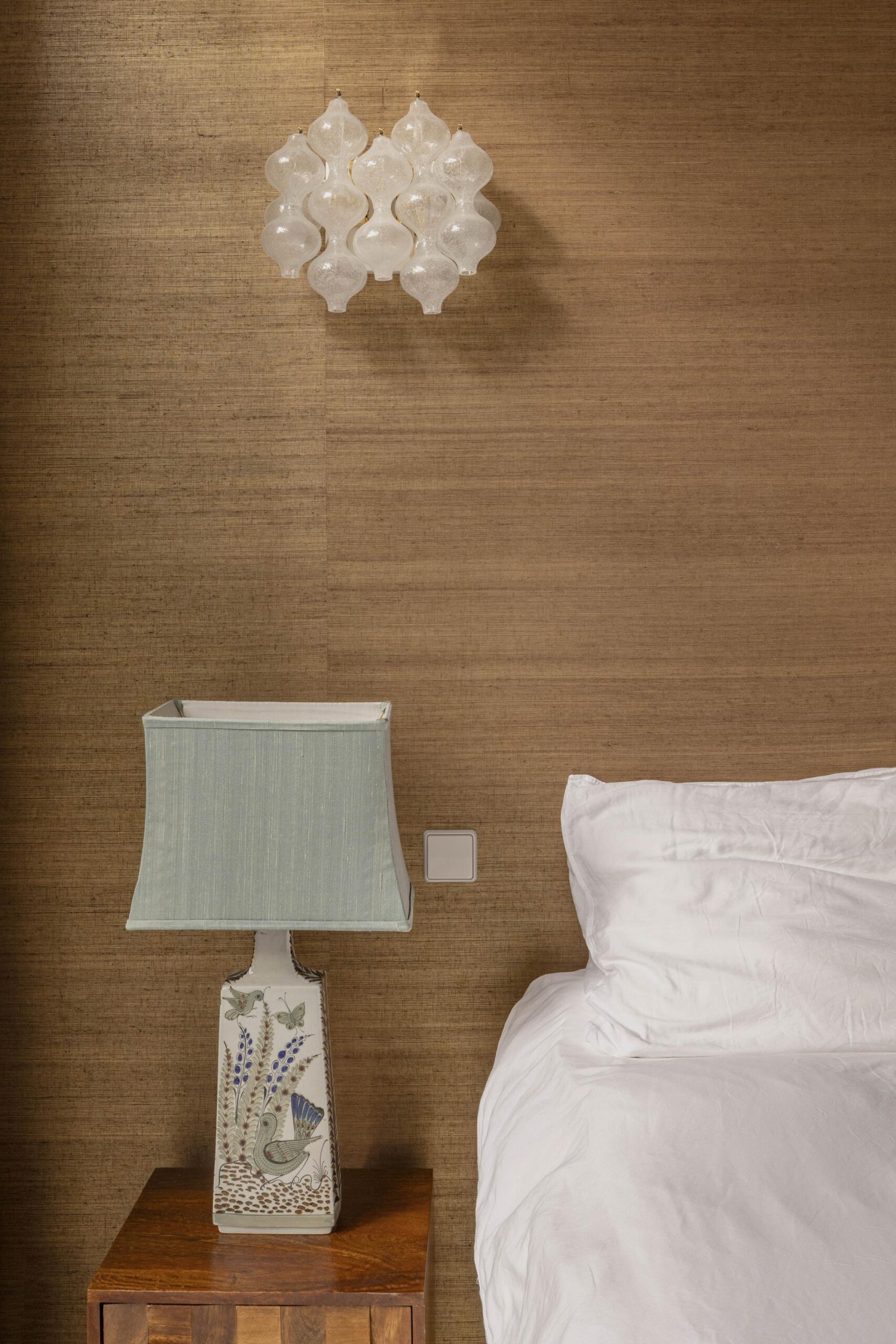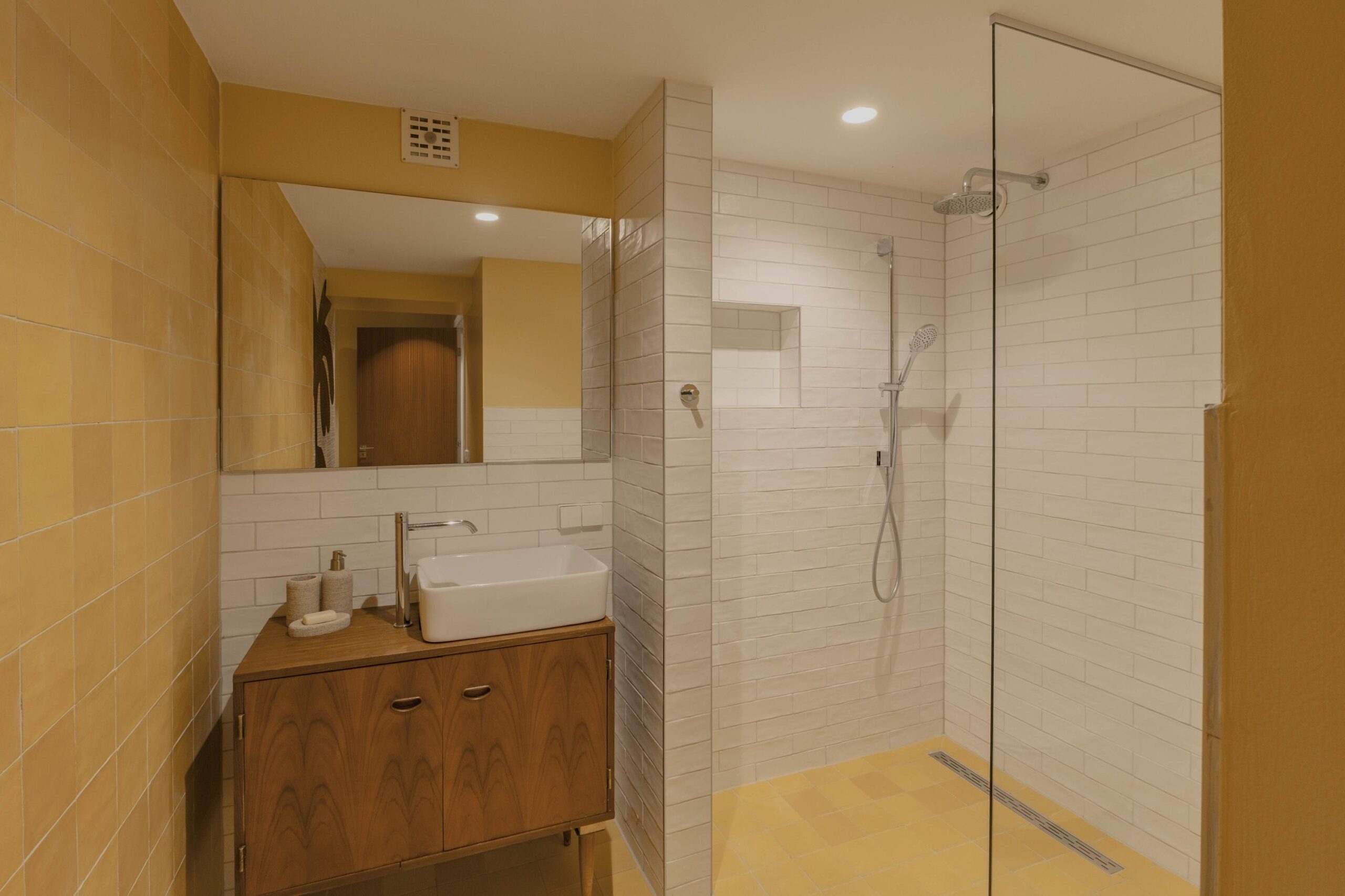 On the first floor are three spacious bedrooms. The generous master bedroom is cleverly designed with custom-made wooden closets that subtly separate the sleeping area from the wardrobe zone. An adjoining en-suite bathroom features a freestanding bathtub, walk-in shower, and double washbasin — a spa-like space with refined natural stone finishes.