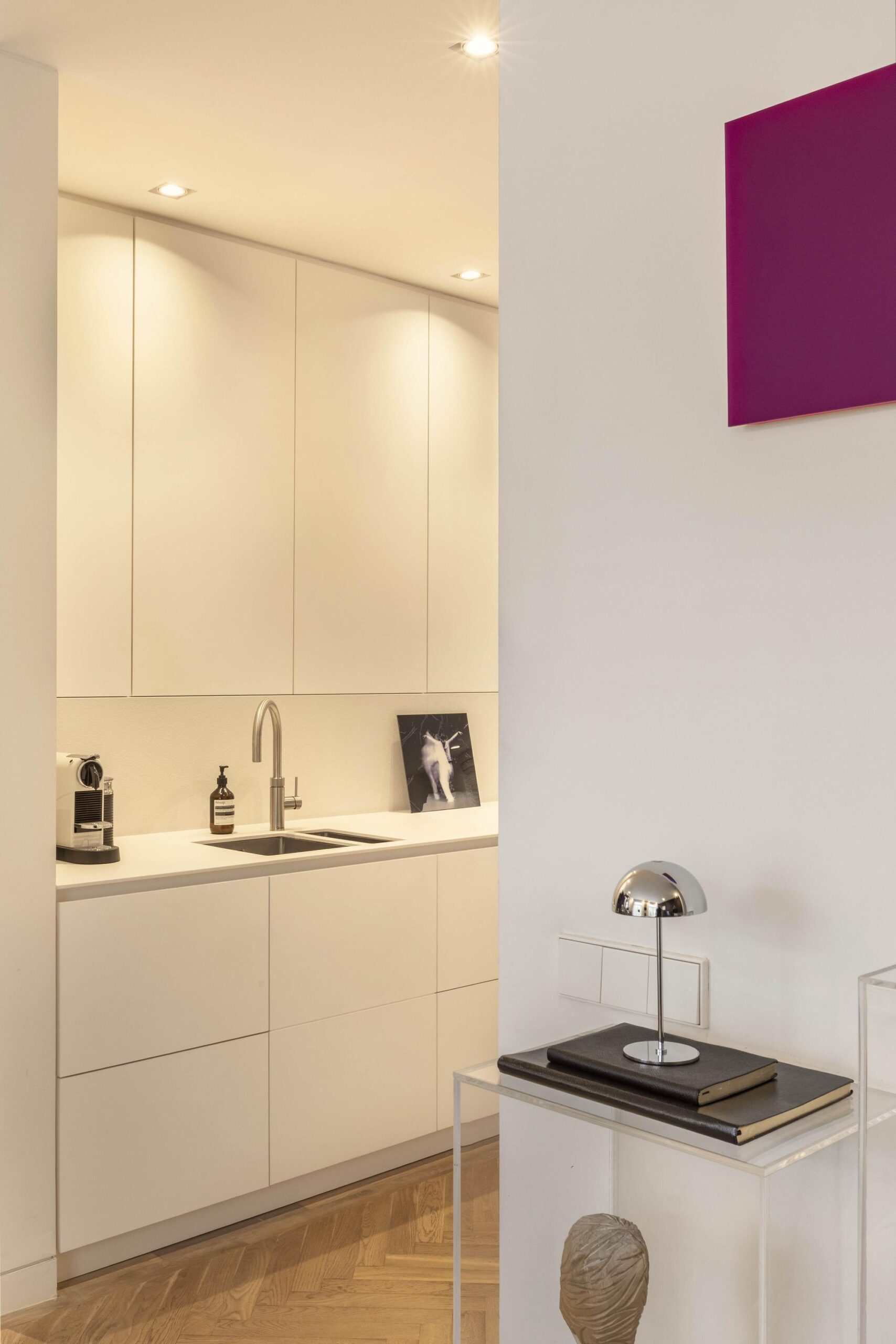 The living floor comprises a spacious and bright living room and ding room. In the centre of the apartment is the open kitchen, which naturally connects the two spaces. This layout allows modular use and easy reconfiguration. The kitchen, like the rest of the floor, is finished to a high standard with natural materials. The dining room features a charming French balcony. At the rear, the living room provides access to the spacious balcony. The layout has been thoughtfully designed, with high ceilings and plenty of natural light.