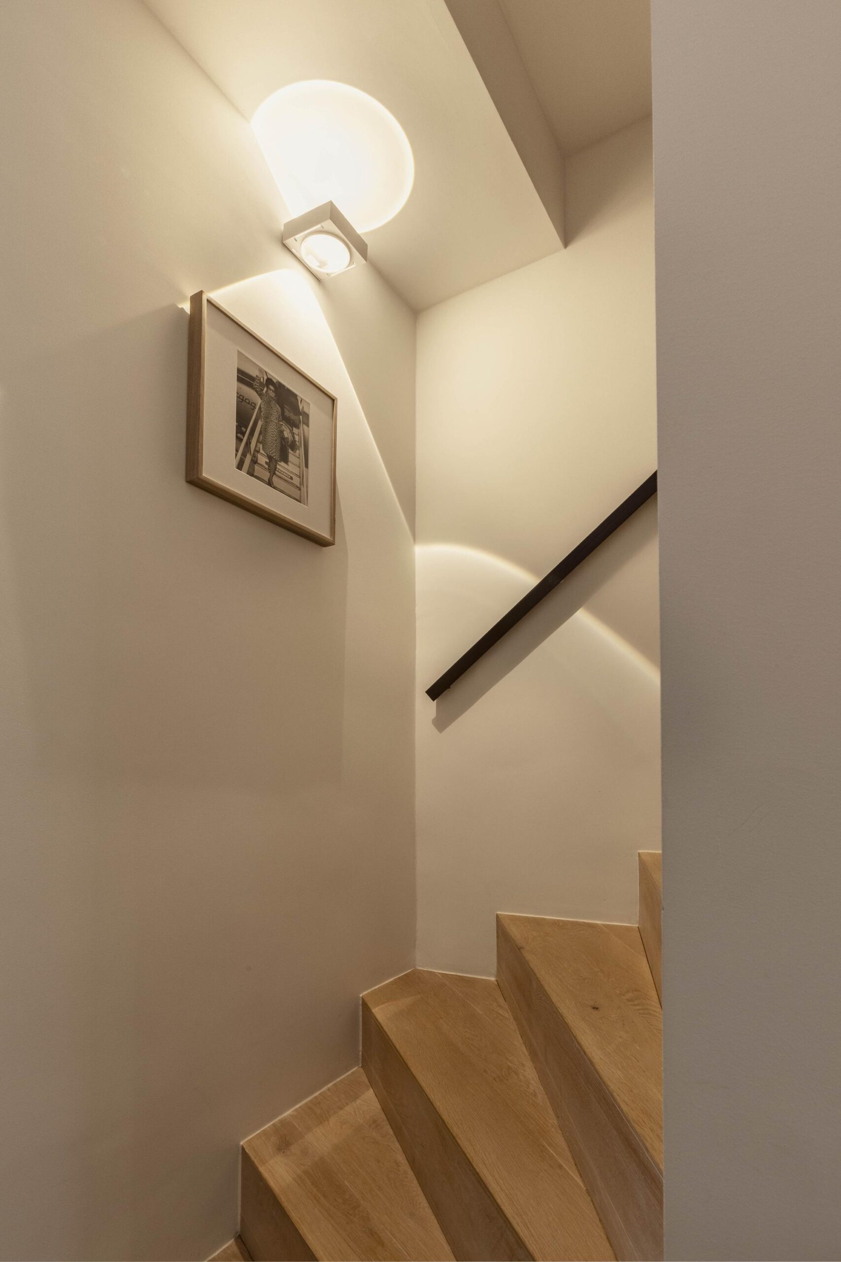 The apartment is accessed via an oak staircase leading to the second floor. The staircase opens directly into the hallway connecting the living room at the rear and the dining room at the front. The hallway also includes a built-in wardrobe.