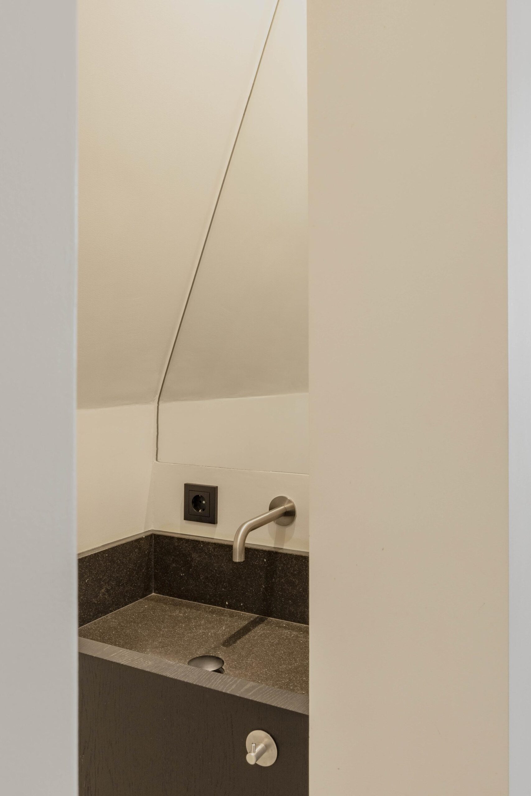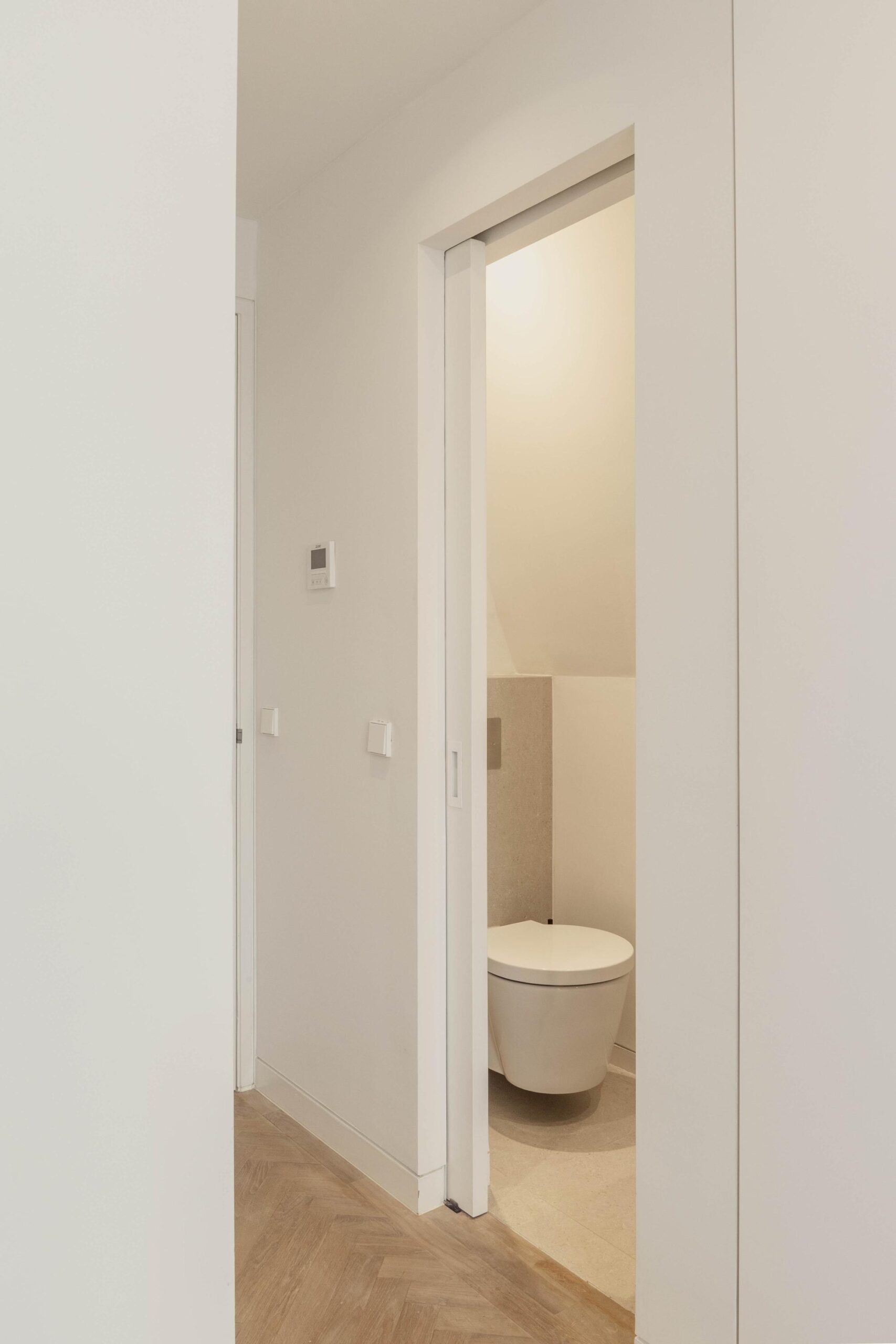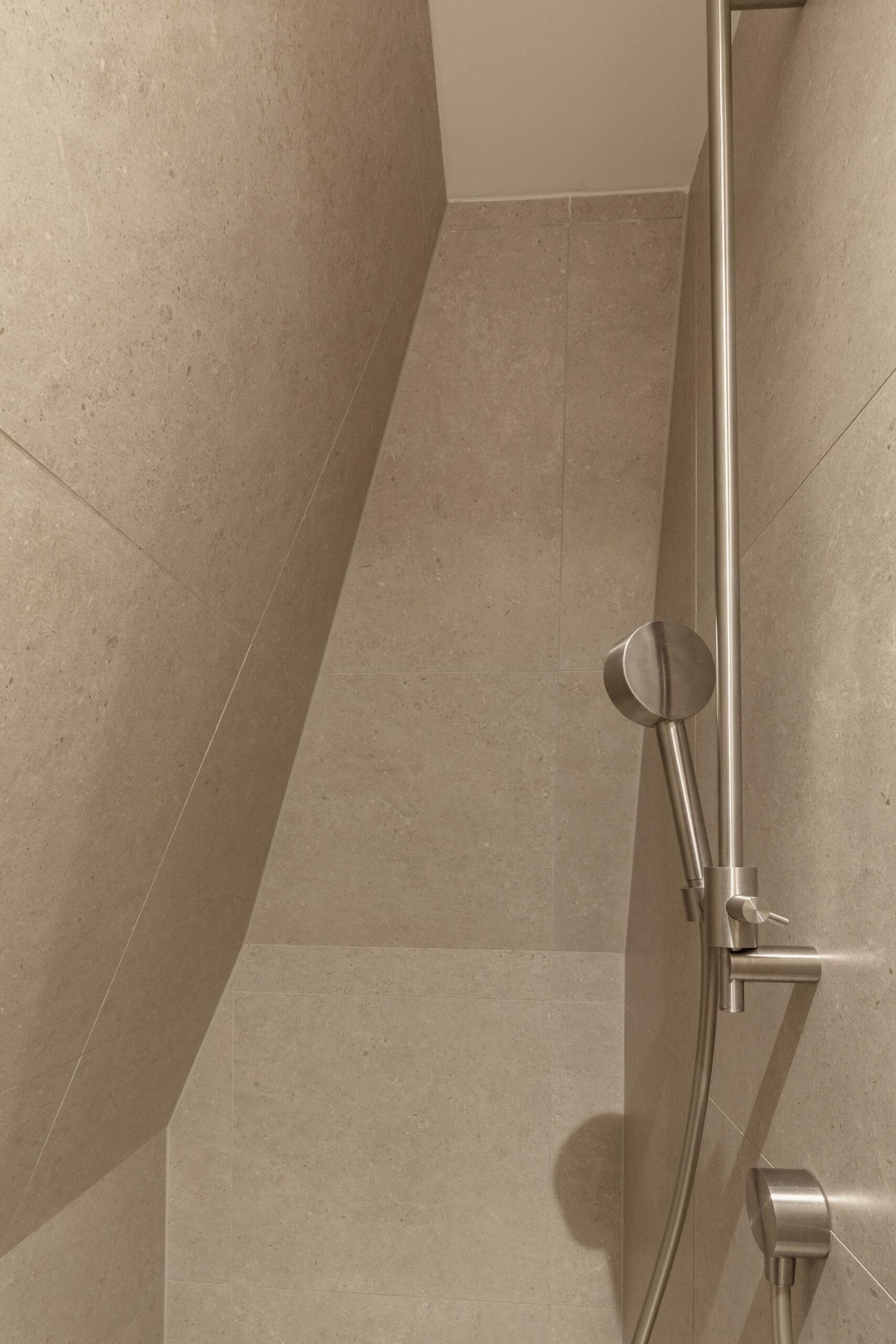 On the third floor are two bedrooms and two modern bathrooms. The master bedroom, located at the rear, features an en-suite bathroom with walk-in shower and washbasin, a separate toilet and a built-in wardrobe with integrated TV. The second bedroom is situated at the front. Both bathrooms are finished in a modern style. A third room on this floor offers flexible use as a study, guest room or dressing room.