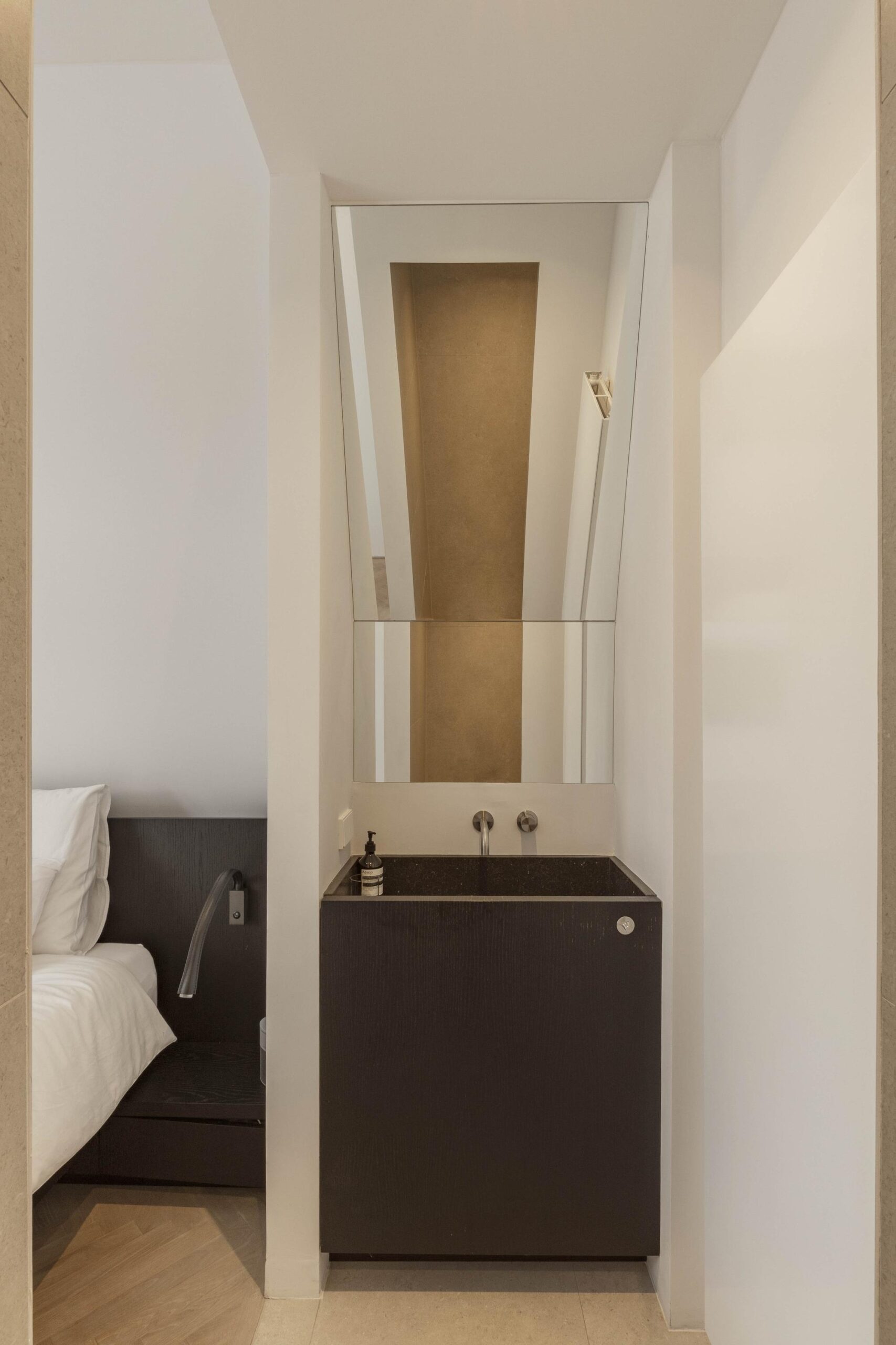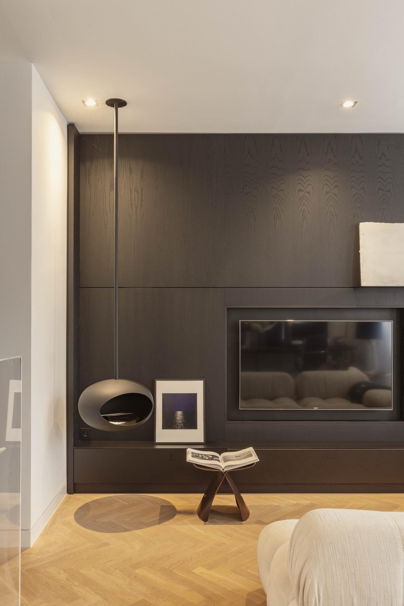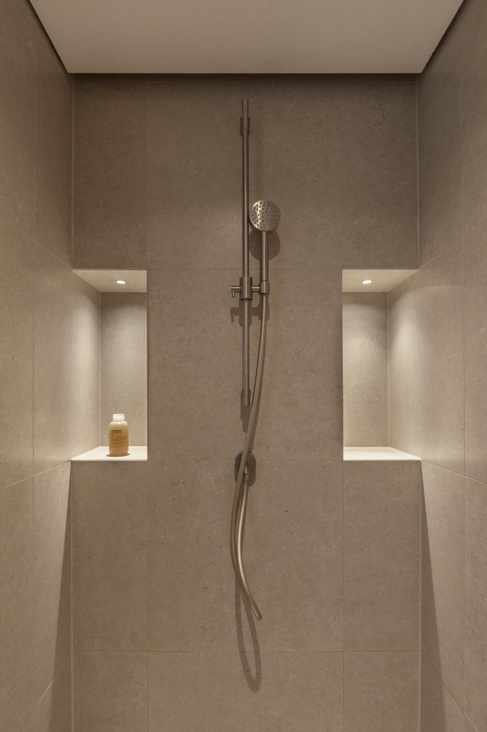 On the third floor are two bedrooms and two modern bathrooms. The master bedroom, located at the rear, features an en-suite bathroom with walk-in shower and washbasin, a separate toilet and a built-in wardrobe with integrated TV. The second bedroom is situated at the front. Both bathrooms are finished in a modern style. A third room on this floor offers flexible use as a study, guest room or dressing room.