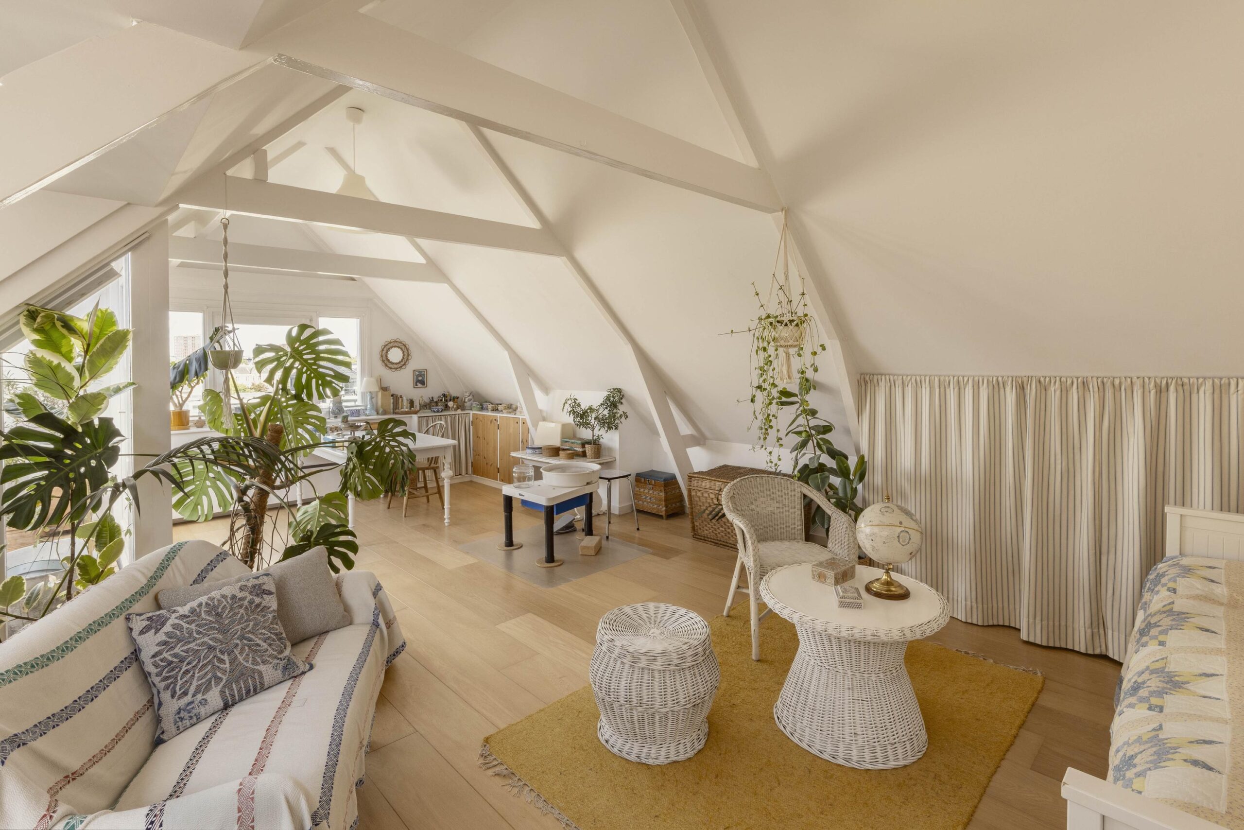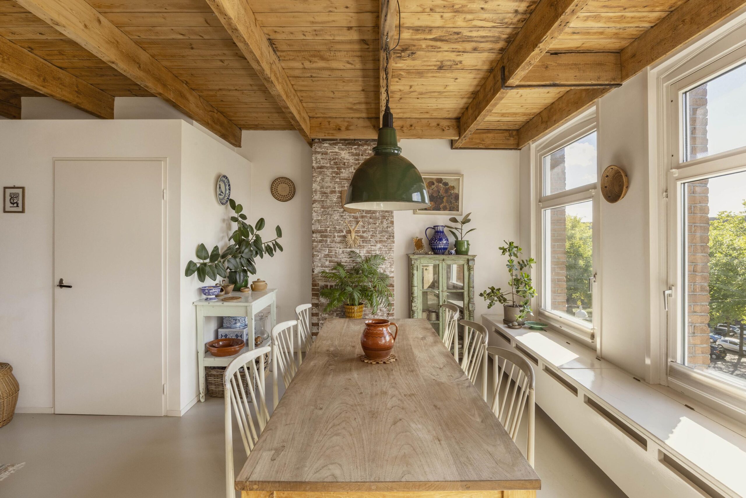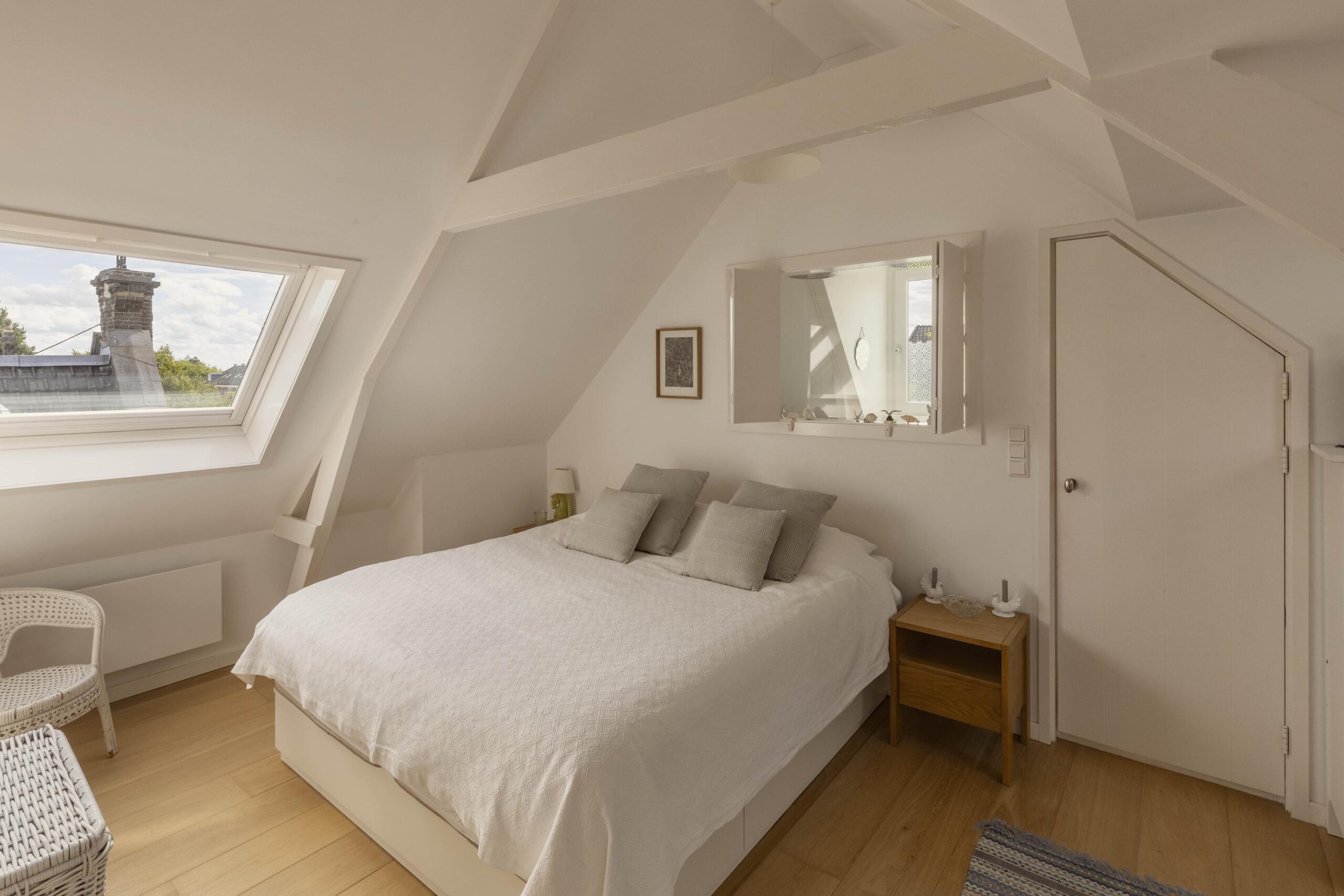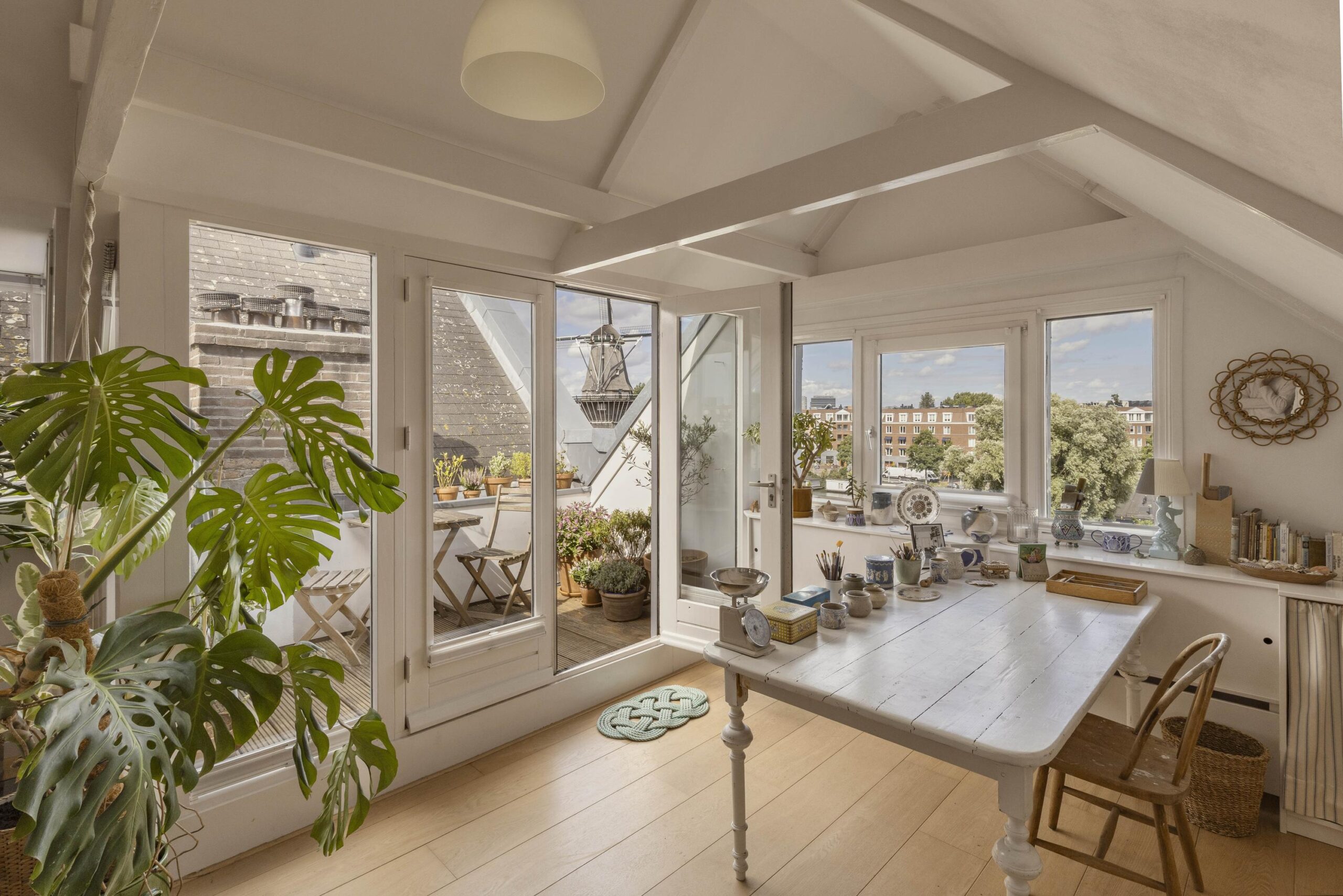 A fixed staircase leads to the top floor, a bright, open space with soaring ceilings of up to 3.20 metres. White wooden beams highlighting the original roof structure and abundant natural light give this floor a relaxed and charming character. Due to multiple windows, the space is beautifully lit throughout the day.
