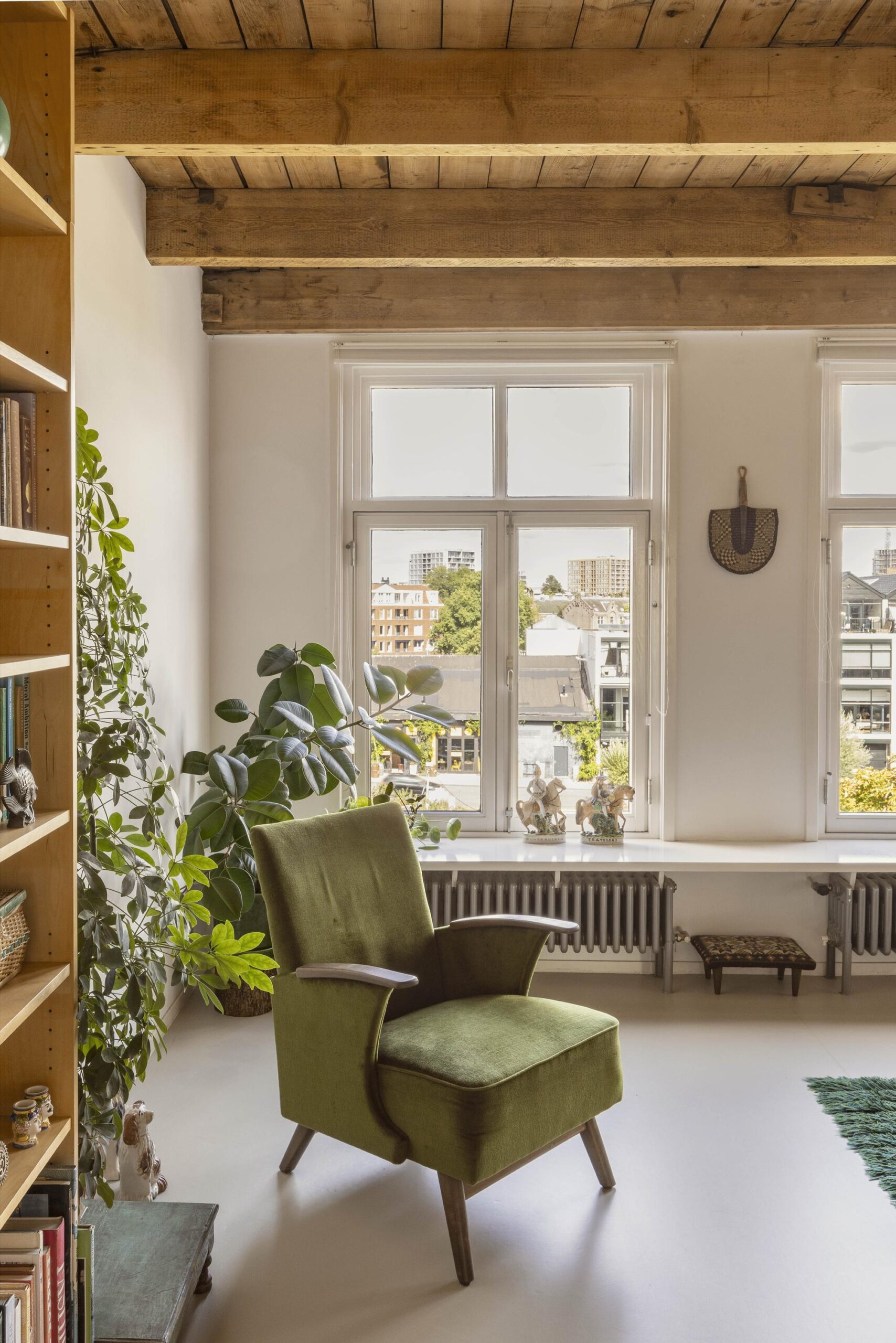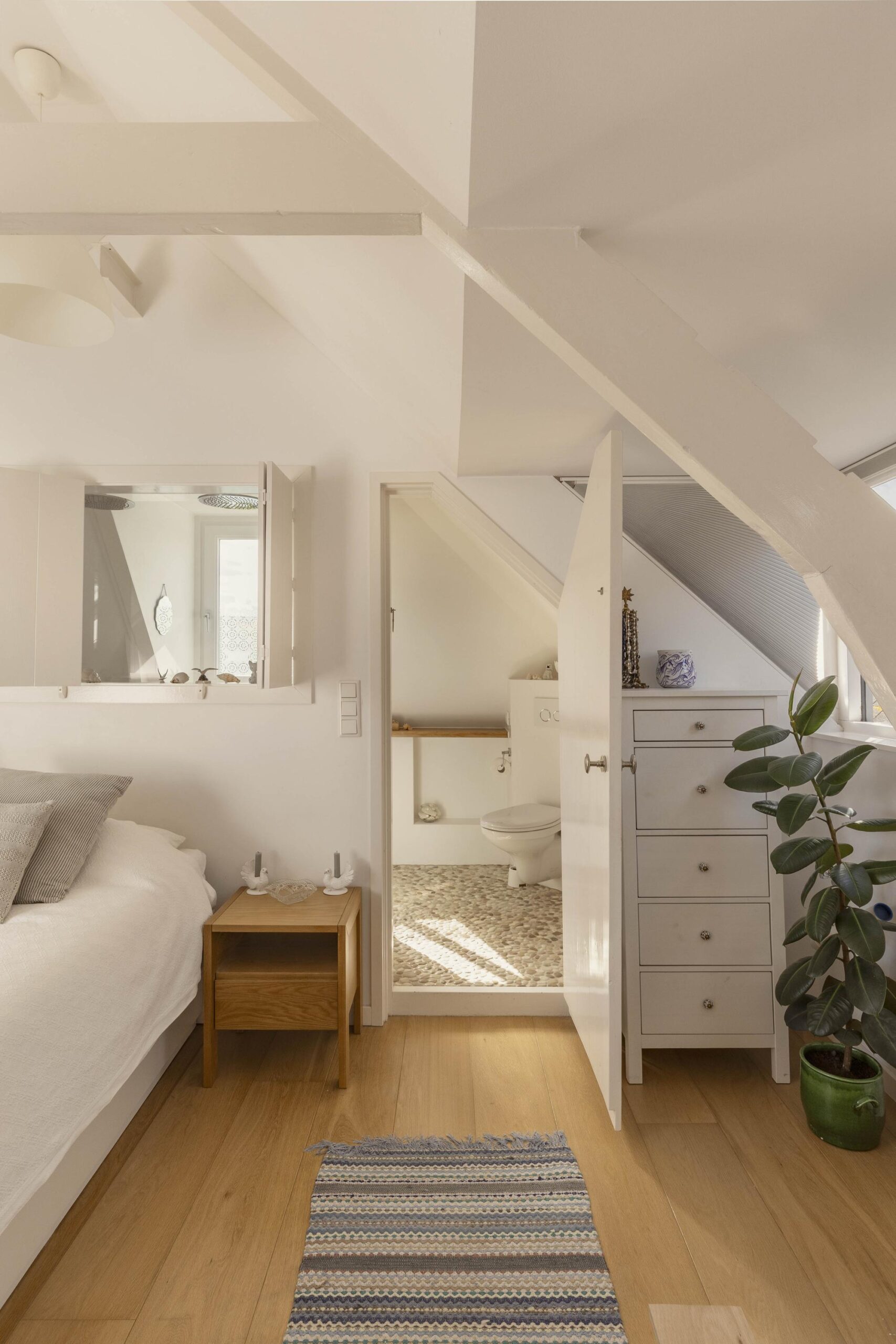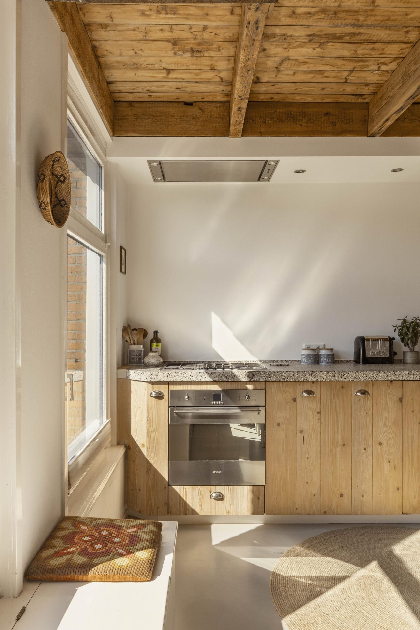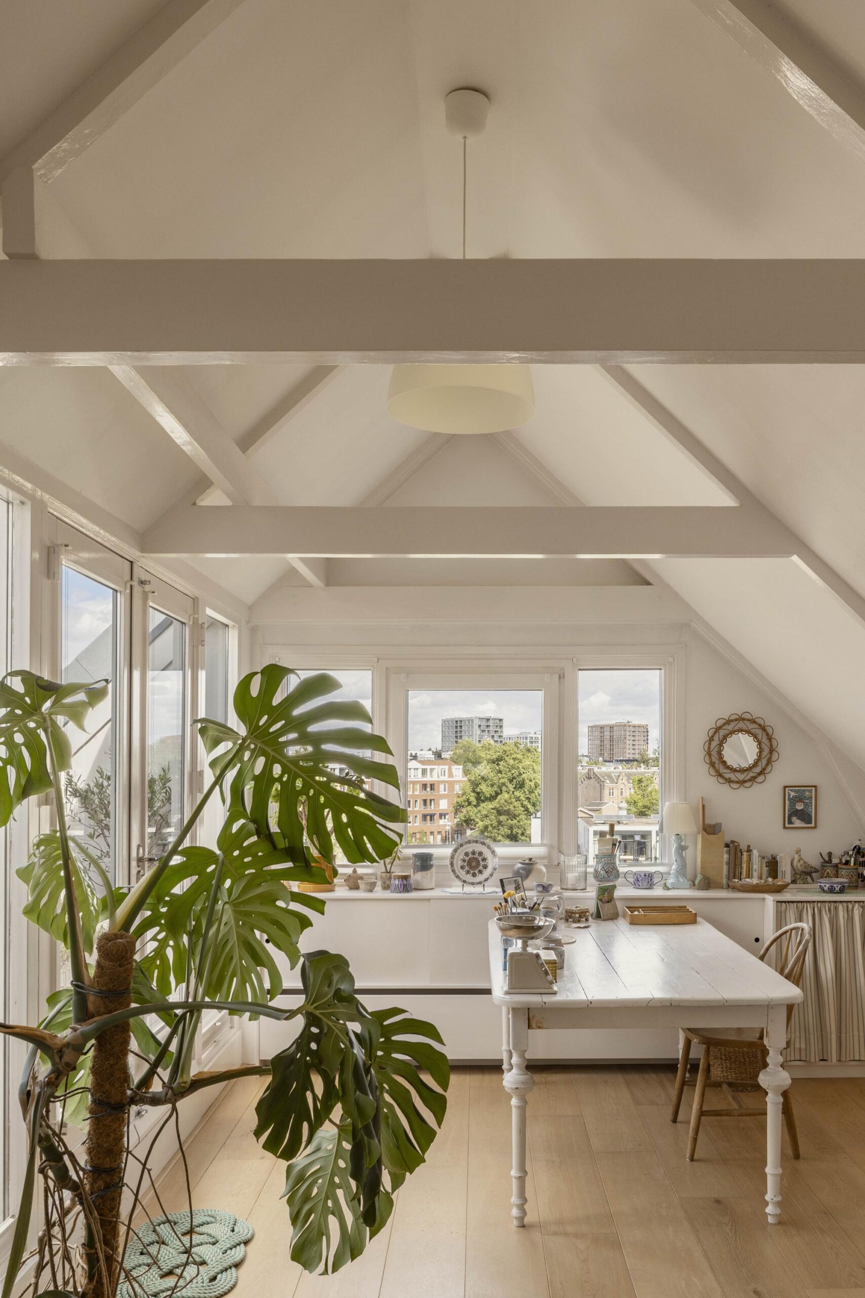 A fixed staircase leads to the top floor, a bright, open space with soaring ceilings of up to 3.20 metres. White wooden beams highlighting the original roof structure and abundant natural light give this floor a relaxed and charming character. Due to multiple windows, the space is beautifully lit throughout the day.