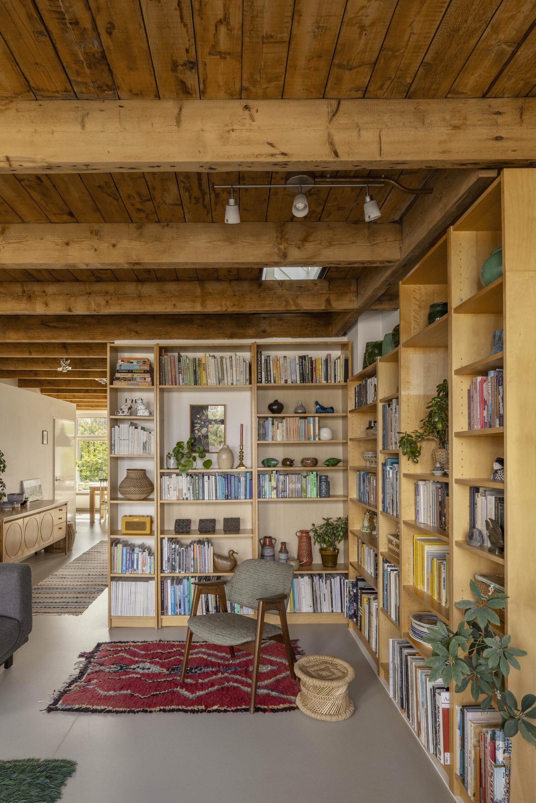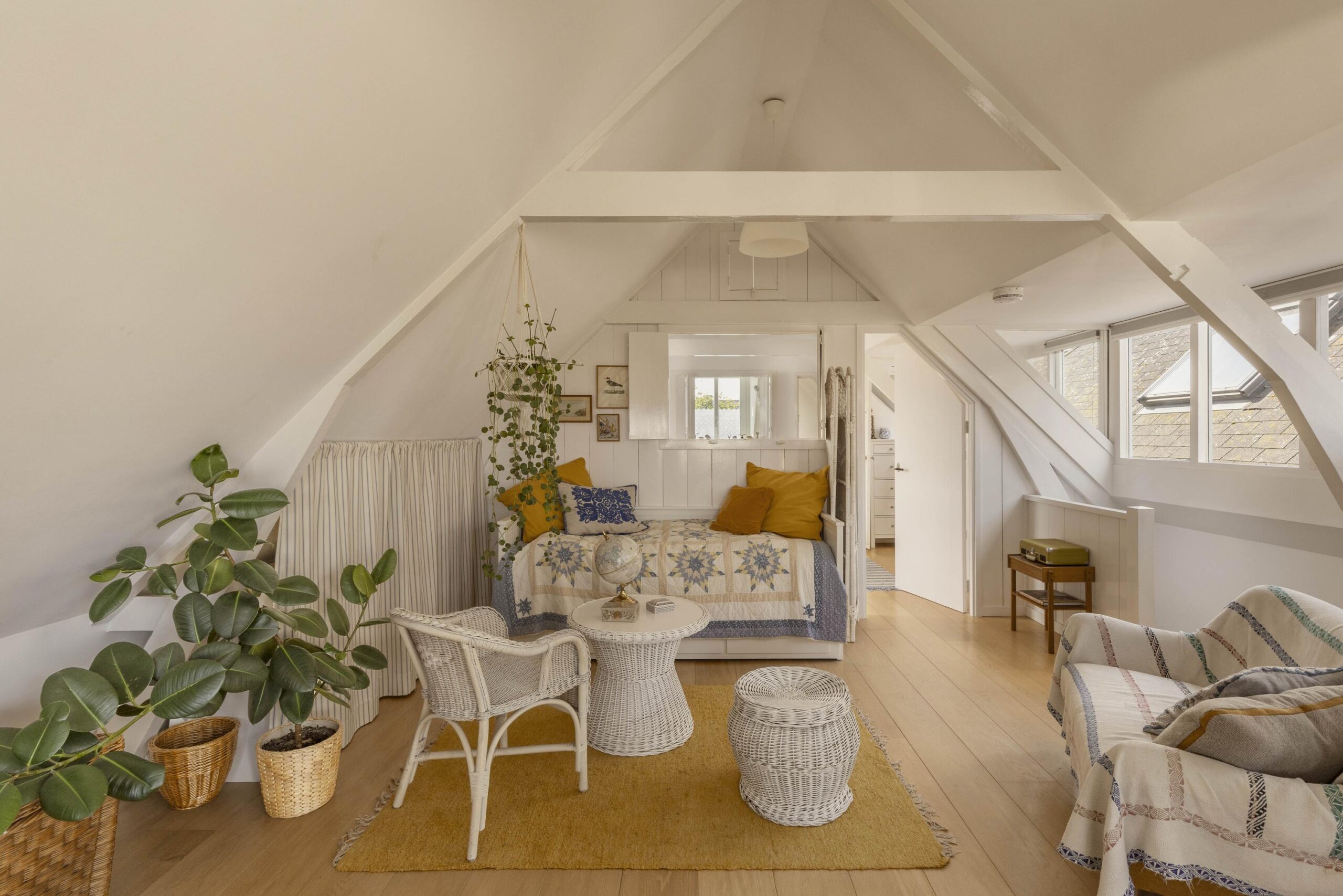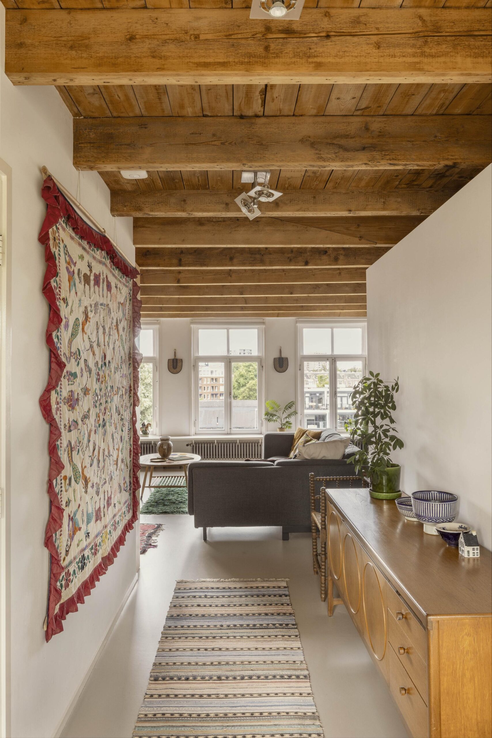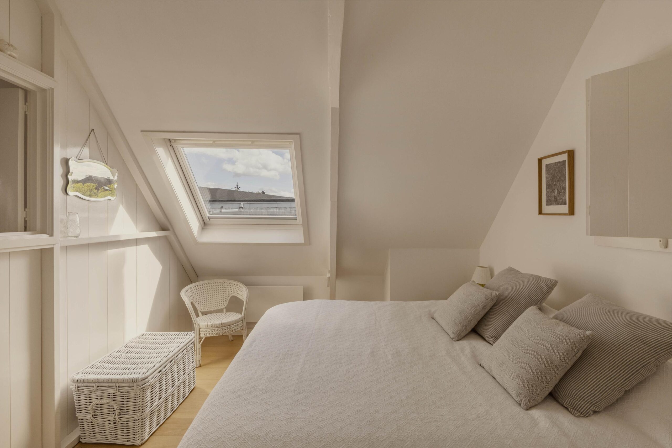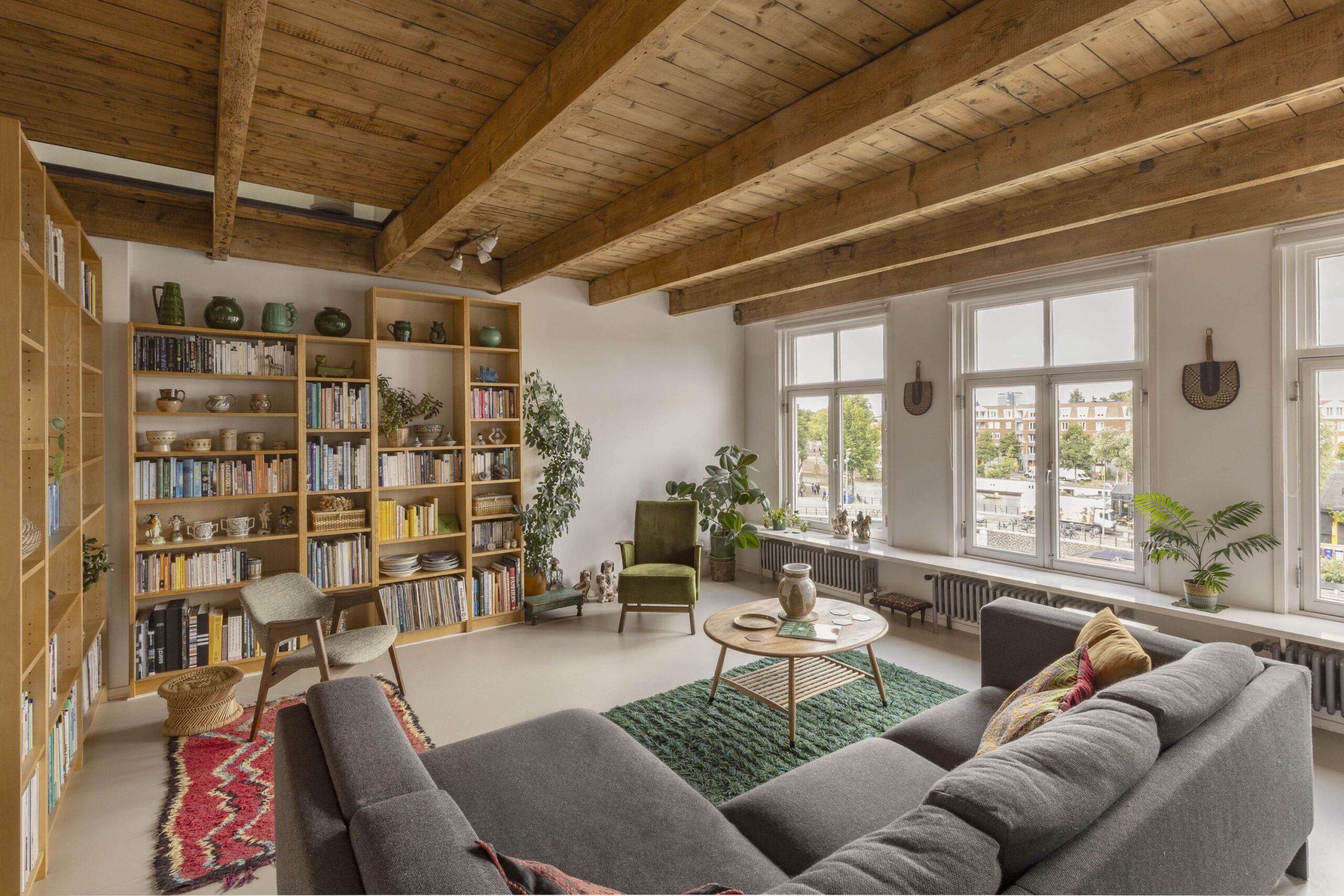 A fixed staircase leads to the top floor, a bright, open space with soaring ceilings of up to 3.20 metres. White wooden beams highlighting the original roof structure and abundant natural light give this floor a relaxed and charming character. Due to multiple windows, the space is beautifully lit throughout the day.