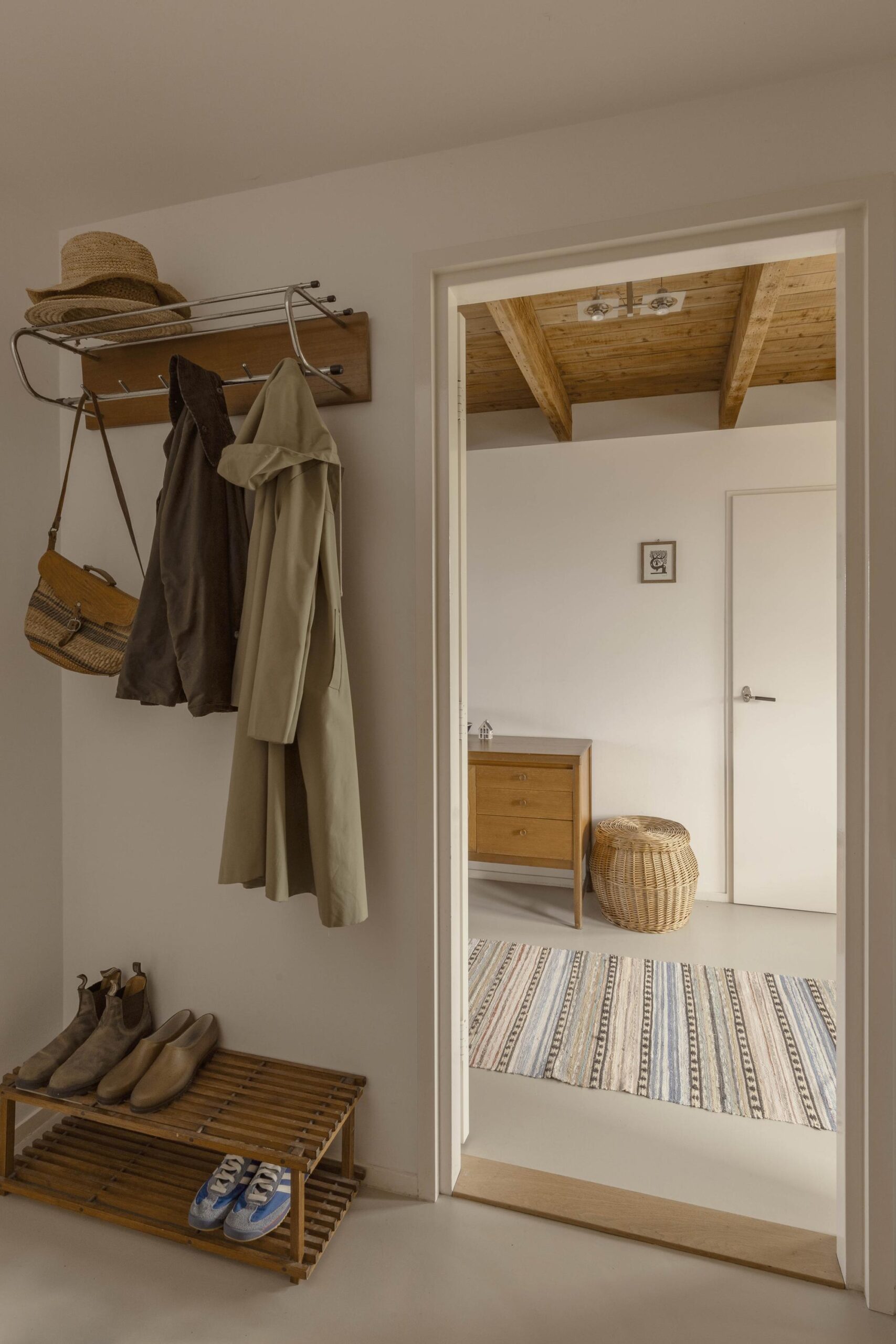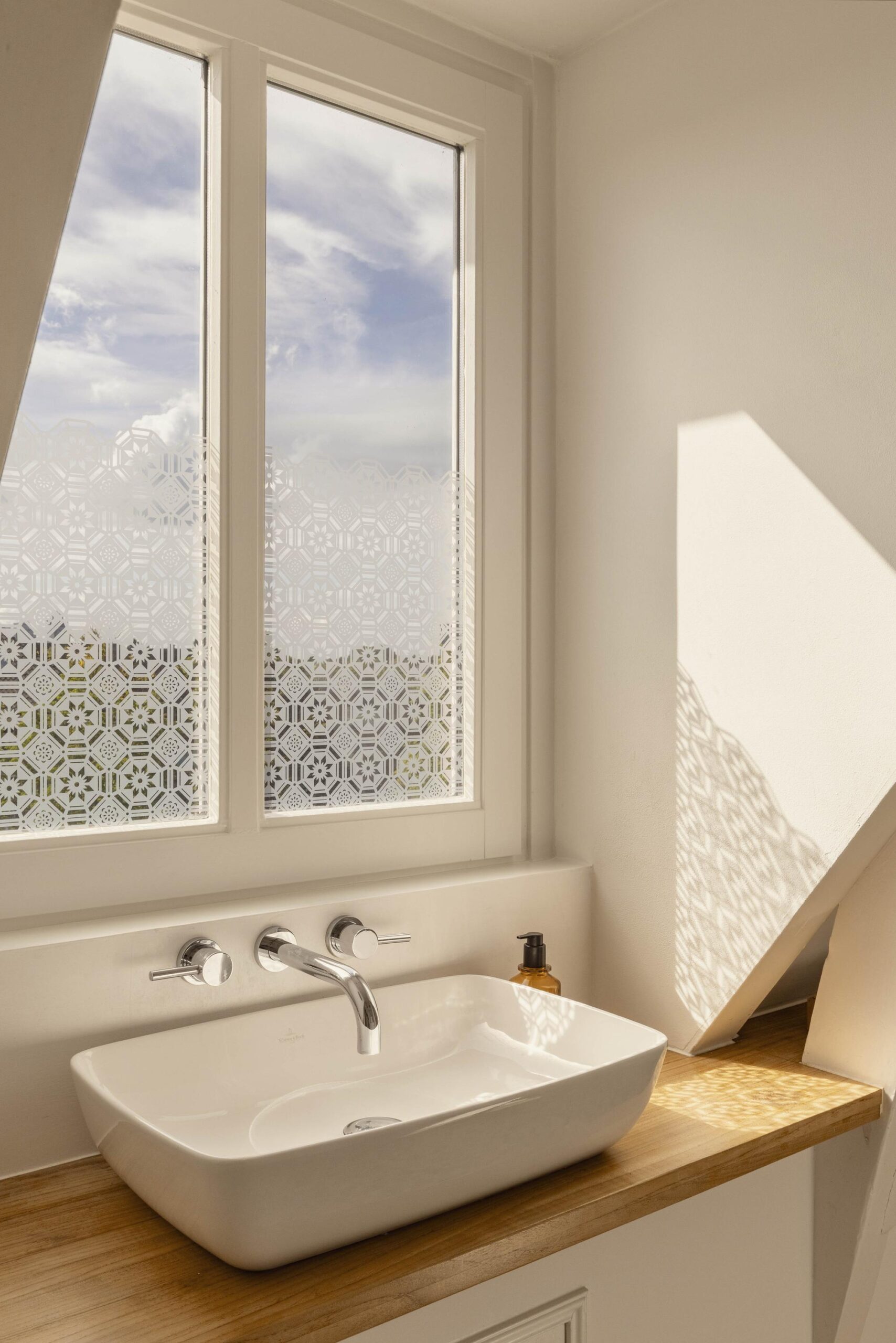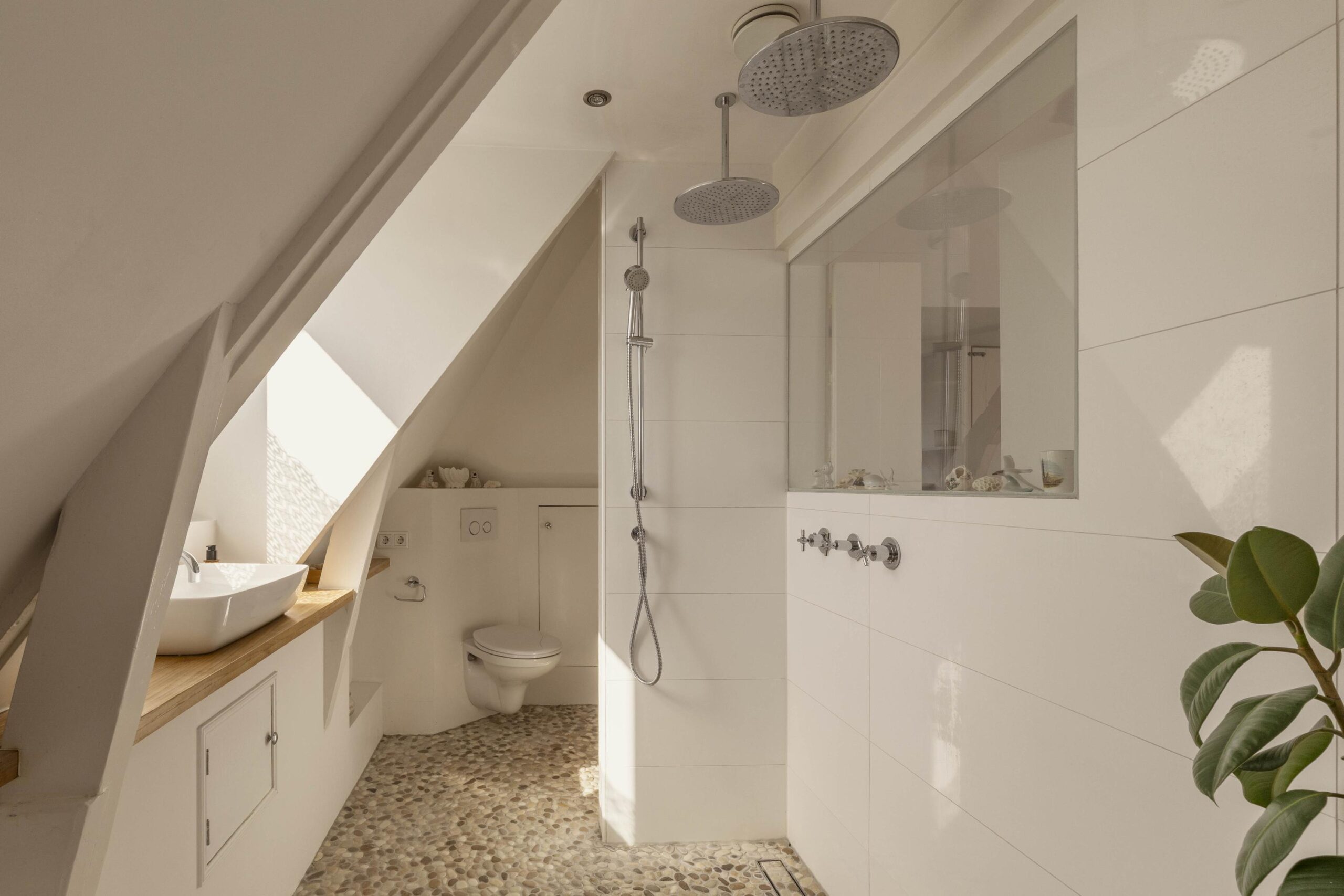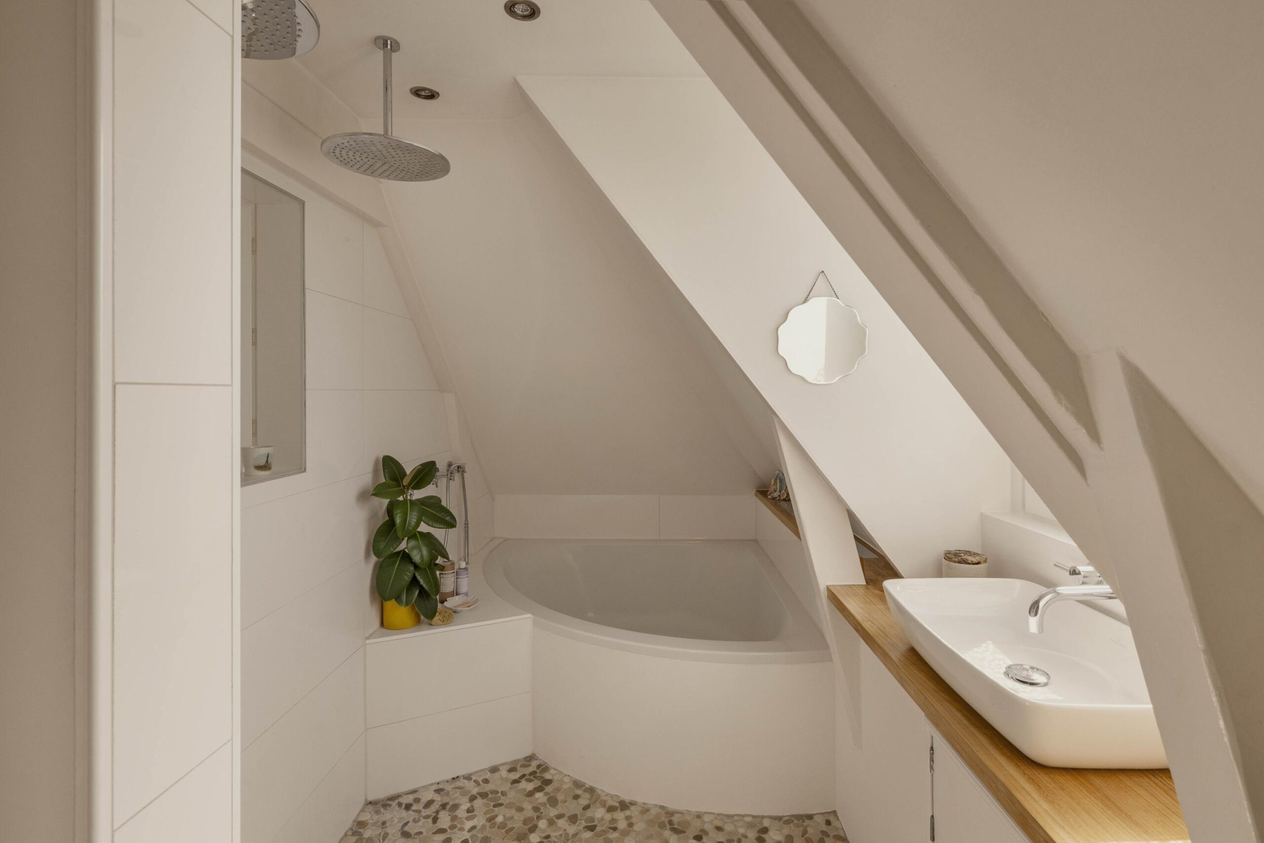 A fixed staircase leads to the top floor, a bright, open space with soaring ceilings of up to 3.20 metres. White wooden beams highlighting the original roof structure and abundant natural light give this floor a relaxed and charming character. Due to multiple windows, the space is beautifully lit throughout the day.